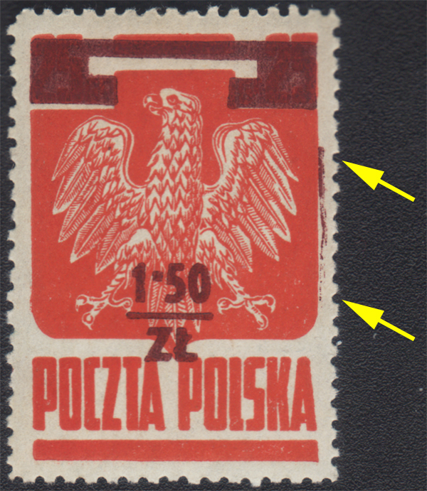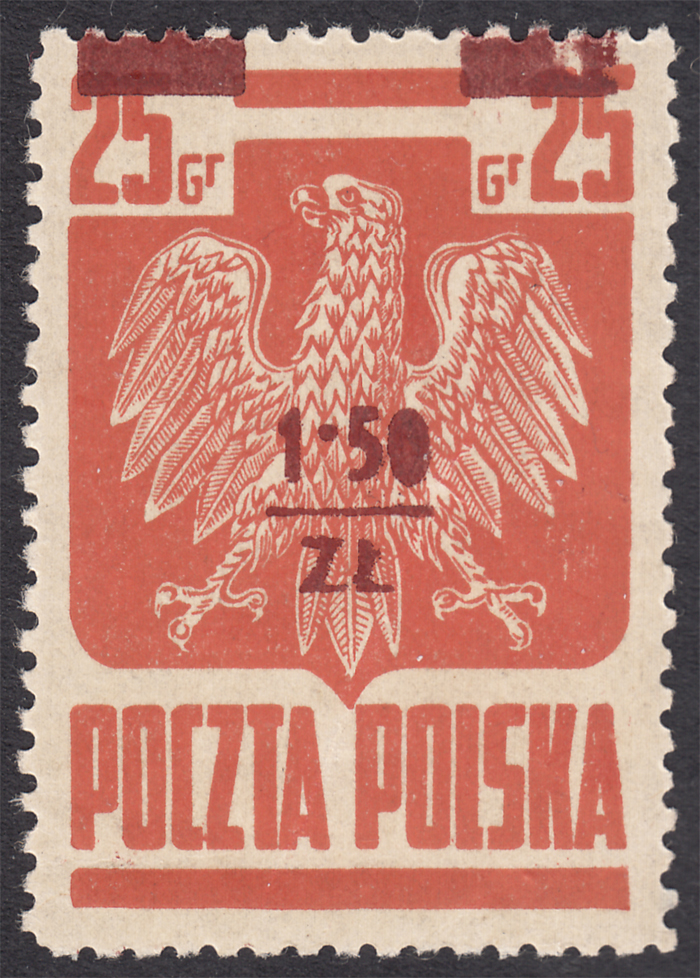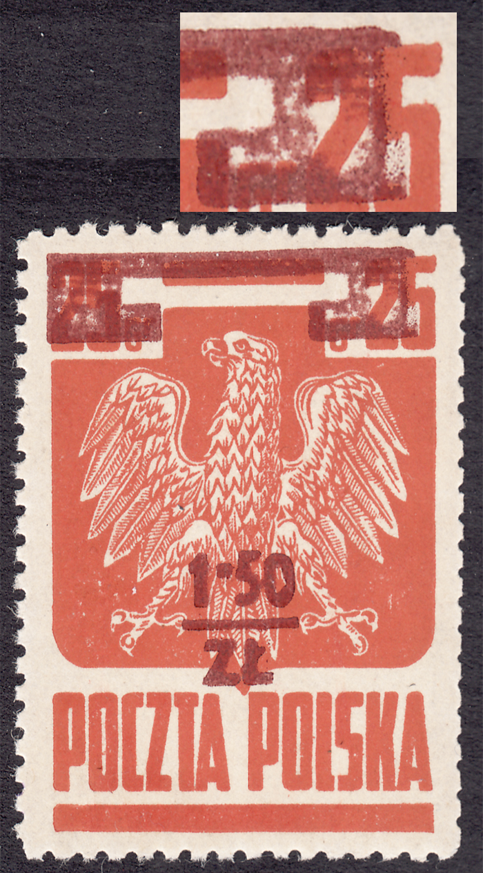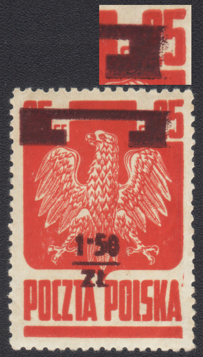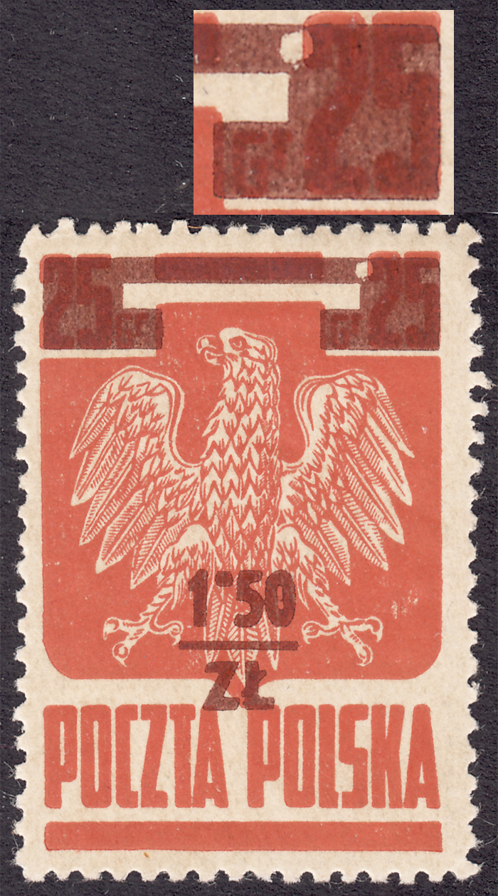 1945 wydanie przedrukowe, makulaturowy znaczek za 1,50 zł./25 gr. w kolorze brązowoczerwonym z przesuniętym nadrukiem - poz.21, ma bardzo charakterystyczną mocno zdeformowaną belkę - przypadek szczególny opisany przez L.Schmutza "Przegląd Filatelistyczny" Nr.7/2007 "klisza tego nadruku była wyższa niż sąsiednie - była pochyło zamocowana - ... W trakcie kolejnych operacji przedrukowych belka tej kliszy była coraz bardziej rozpłaszczana - niejako rozwalcowywana... ", w efekcie końcowym powstał błąd spotykany zwykle po prawej stronie arkusza i określany jako "dziura w belce" w tym przypadku jest jeszcze "półokrągłe wcięcie w górnej krawędzi belki", na lewym marginesie gruba listwa ochronna, to jeden z najciekawszych znaczków z tej formy w końcowym stadium deformacji, gwarancja i oznaczenie MK Walocha. | Fi.376a MK B Mi.409b |