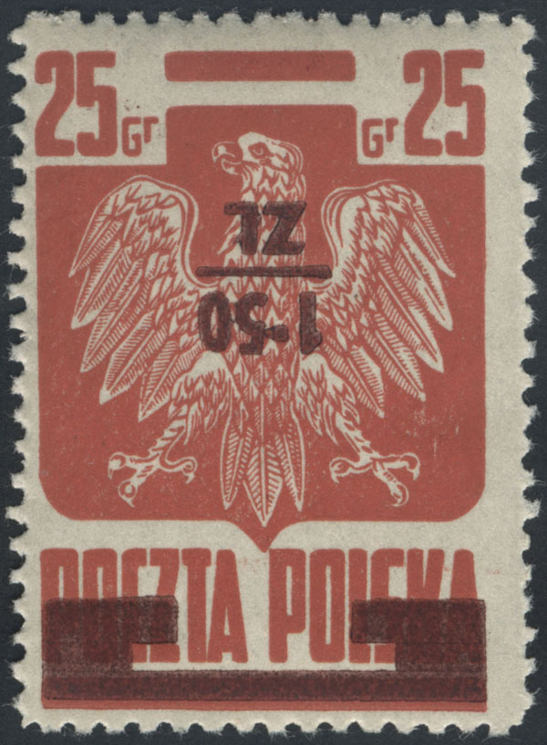 1945 wydanie przedrukowe, znaczek za 1,50 zł./25 gr. z odwróconym nadrukiem III Formy - typ 2 (Fi.550.-), gwarancja i opis Schmutz. | Fi.376a No Mi.409b |