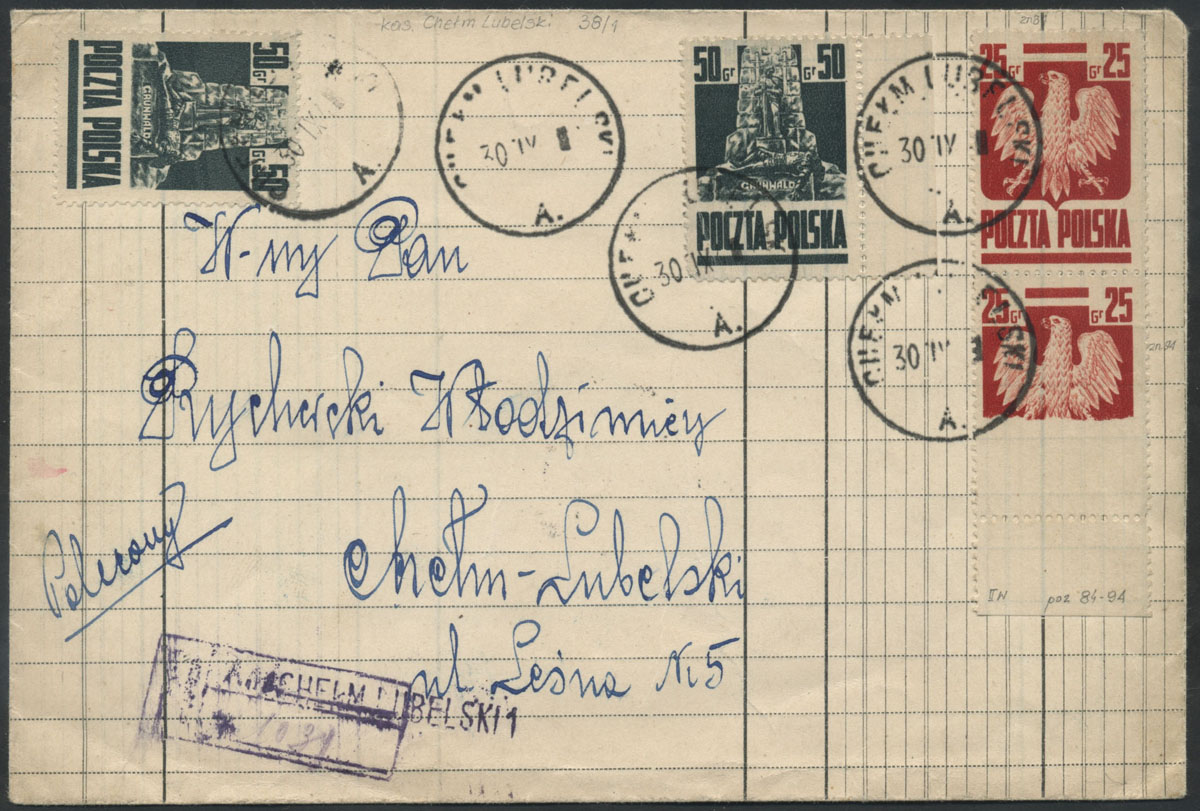 1944 Goznak, list polecony z Chełma Lubelskiego nadany miejscowo 30.09.44, list opłacony makulaturowym znaczkiem za 25 gr. pochodzącym z druku na łączeniu taśm papieru arkuszowego - W EFEKCIE bez dolnej części rysunku znaczka. | Fi.342Mk, 343 Mi.383-4 |