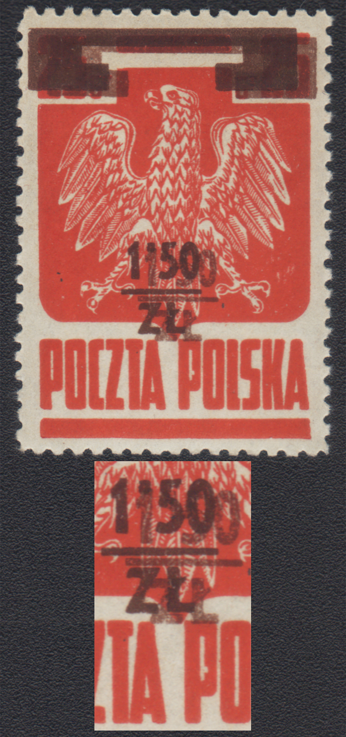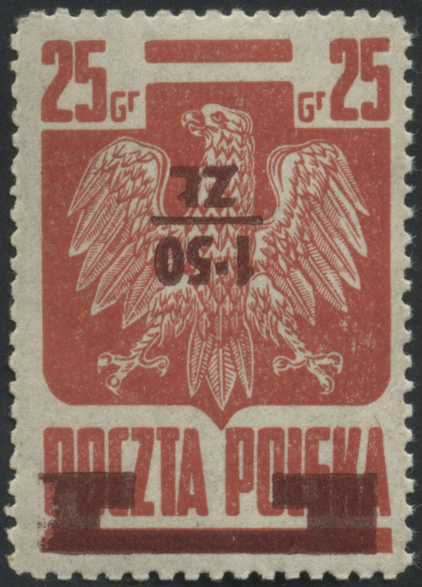 1945 wydanie przedrukowe, znaczek za 1,50 zł./25 gr. z podwójnym nadrukiem III formy przedrukowej na znaczku podstawowym drukowanym I formą typograficzną z występującym w części nakładu błędem na poz.48 "wcięcie wewnątrz litery P"; co ciekawe nadruki są wzajemnie obrócone i znaczki z różnych części tego arkusza mają inne wzajemne położenie nadruków i intensywność farby, ciemny nadruk jest podobnie położony w całym arkuszu, jasny jest obrócony i położony po lewej stronie wyżej, a po prawej niżej od ciemnego - rzadki podwójny nadruk na rzadkim błędzie znaczka podstawowego to unikat, podwójna gwarancja z opisem pozycji Schmutz. | Fi.376a Np B Mi.409a DD |