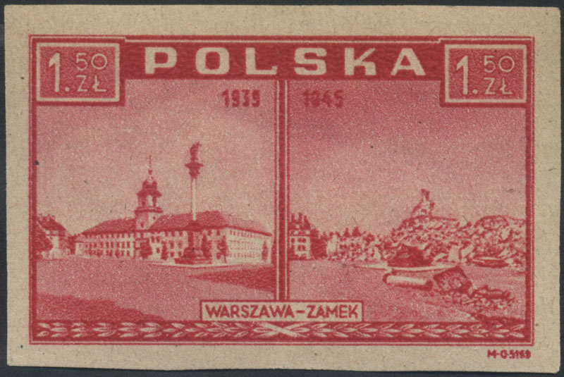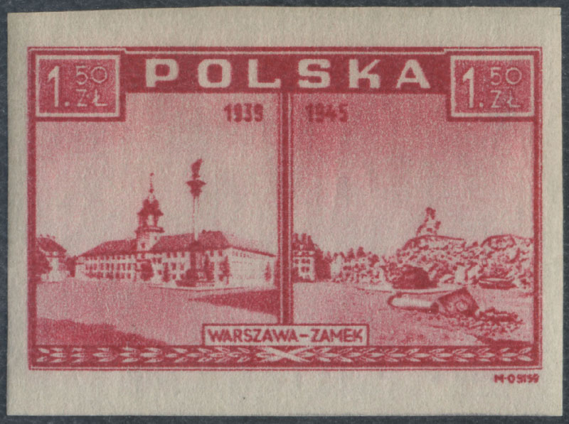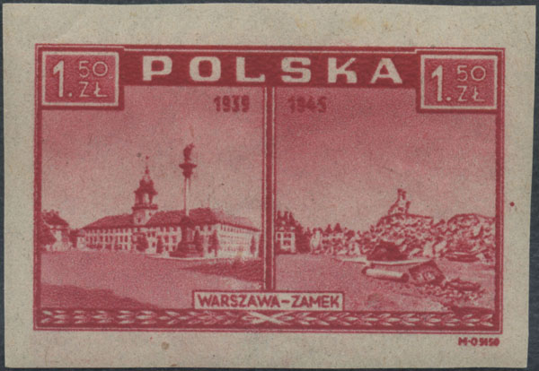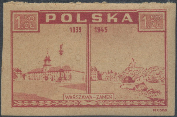 1945 Warszawa oskarża, znaczek w barwie karminowoczerwonej o nieostrym rysunku na papierze y4a, gwarancja i oznaczenie Walocha. | Fi.380b Mi.414 |