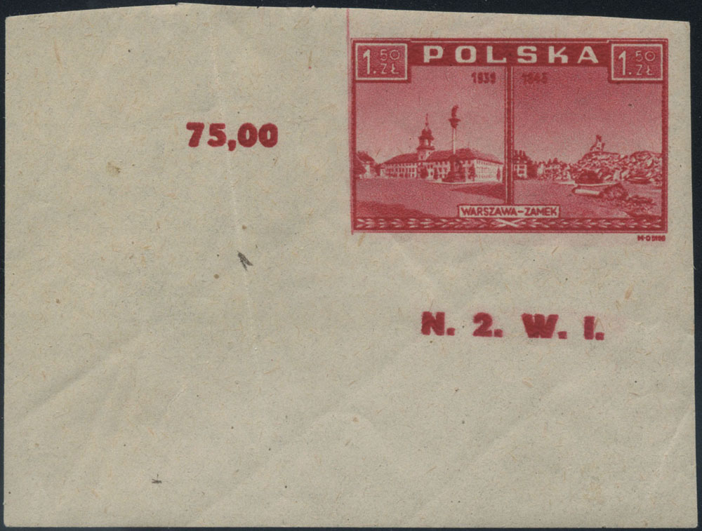 1945 Warszawa oskarża, znaczek w barwie karminowoczerwonej o nieostrym rysunku na papierze x2, gwarancja i oznaczenie Walocha. | Fi.380b Mi.414 |