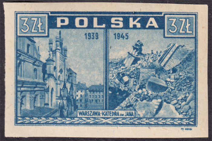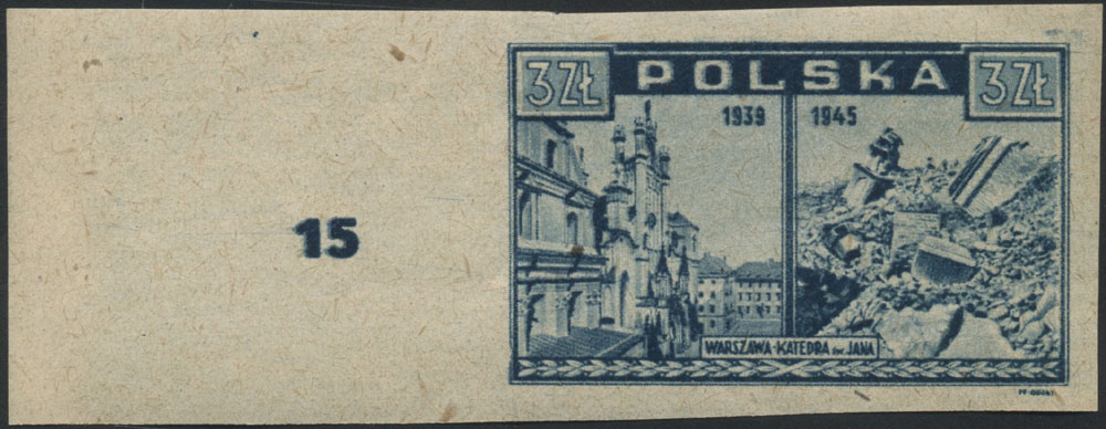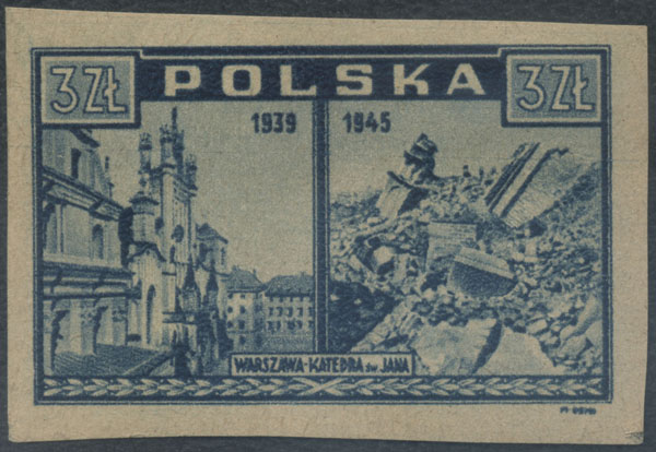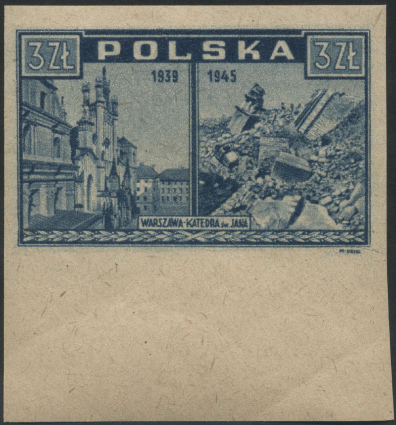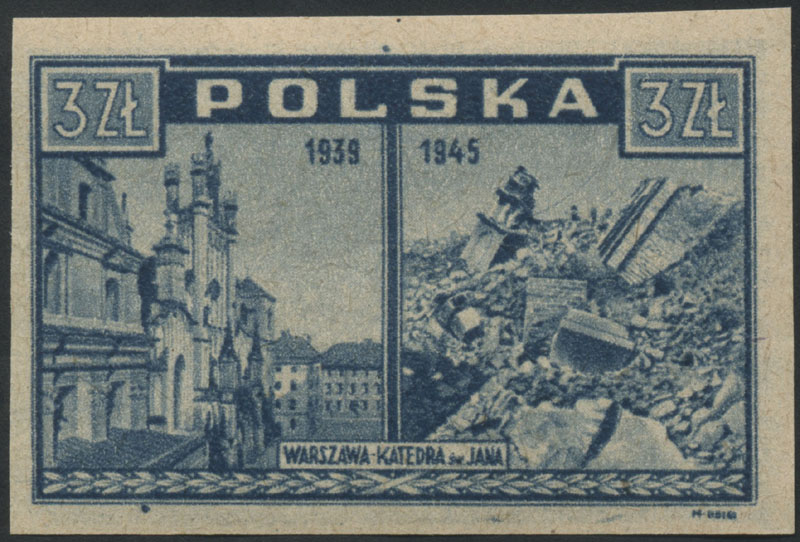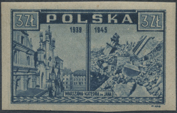 1945 Warszawa oskarża, znaczek w barwie jasno szaroultramarynowej na papierze y2a, gwarancja i oznaczenie Walocha. | Fi.381h Mi.415 |