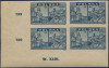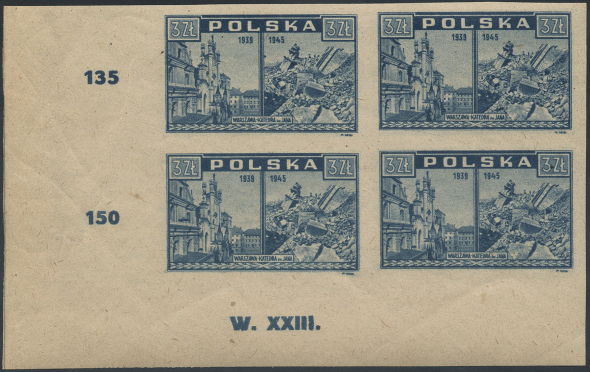 1945 Warszawa oskarża, czworoblok znaczków w barwie jasno szaroultramarynowej na papierze y2a, lewy górny znaczek z błędem "plamka obok kreski, dolny lewy z błędem "belka", na dolnym marginesie numer walca, gwarancja i oznaczenie Walocha. | Fi.381h B1+B2 Mi.415 |