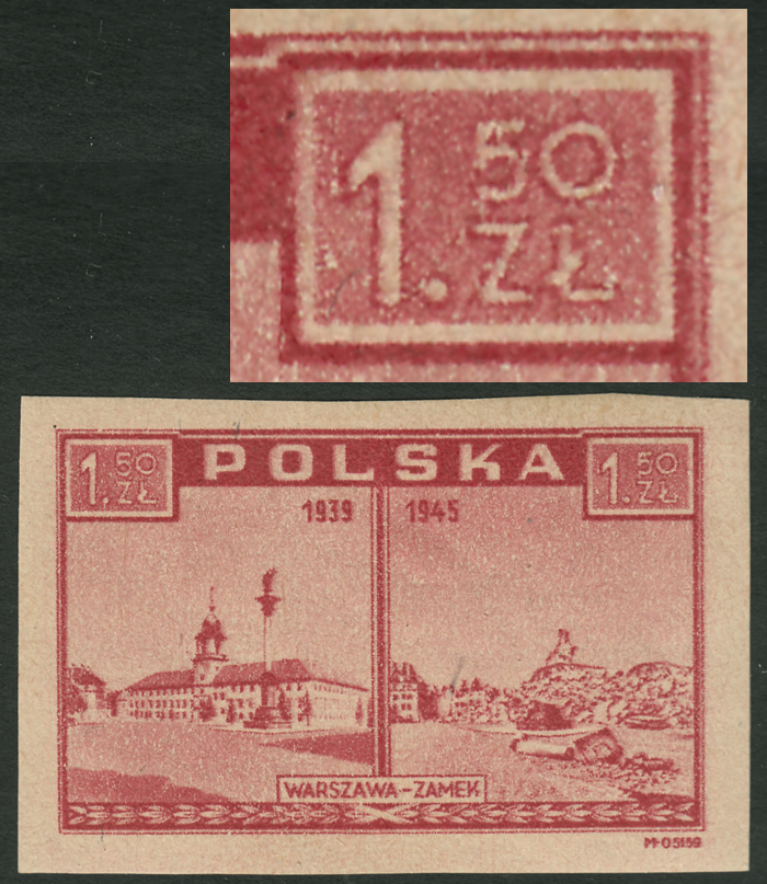 1945 Warszawa oskarża, znaczek za 1,50 zł. w rzadkim kolorze brązowawokarminowym na papierze y4a z niekatalogowanym błędem "zdeformowana cyfra 5 w prawym nominale", dodatkowo kilka białych plamek w jego polu, gwarancja i opis koloru oraz papieru Walocha. | Fi.380e Mi.414 |