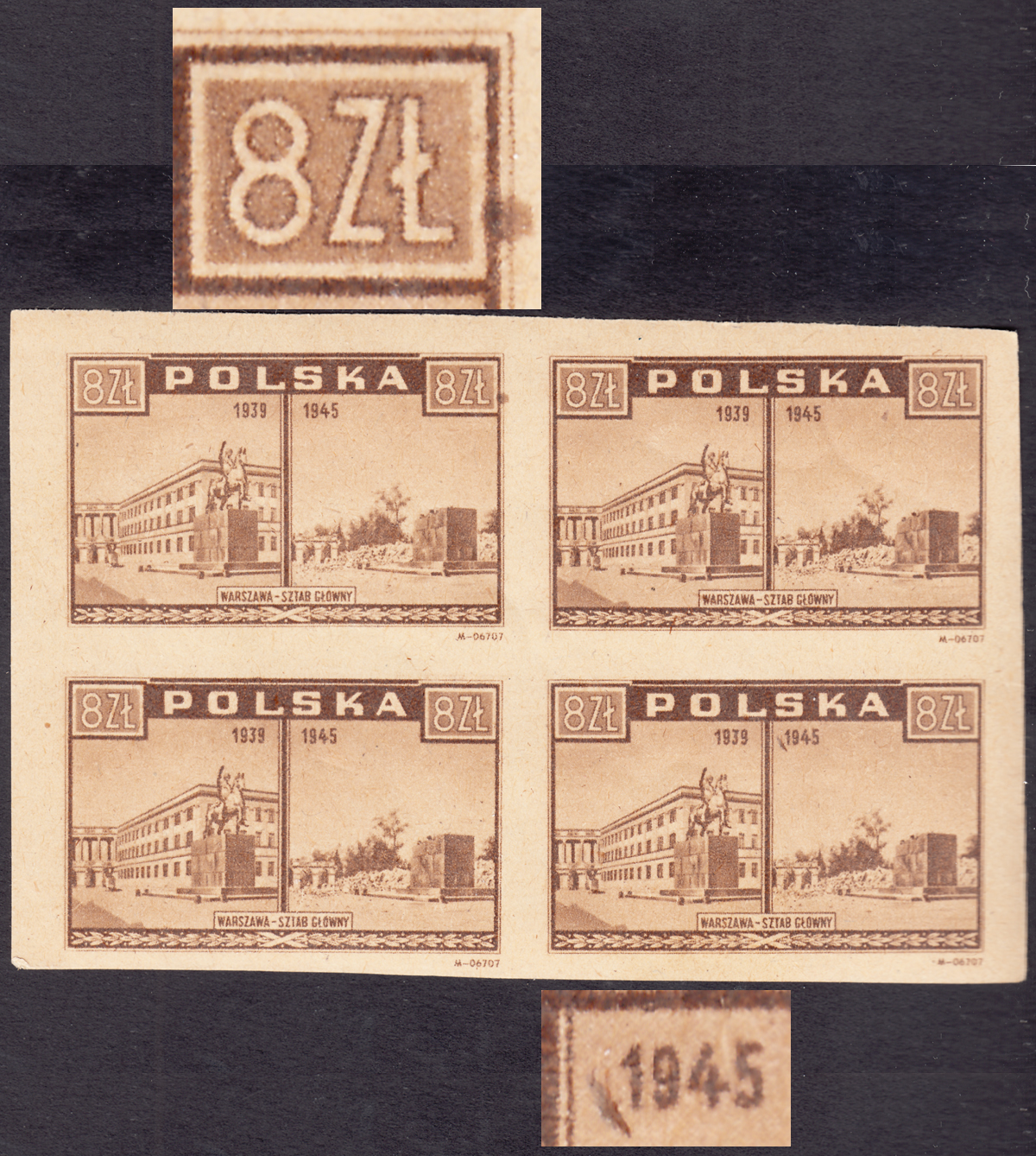 1945 Warszawa oskarża, czworoblok znaczków za 8 zł. w kolorze żółtawobrązowym na papierze szarawożółtawym średnim z błędami, lewy górny znaczek z "kropką obok prawego nominału", a lewy dolny z "rakietą obok daty" - ten drugi to przebarwiona skaza w papierze, gwarancja z opisem barwy i oznaczeniem papieru (y3a) Walocha. | Fi.384d B Mi.418 |