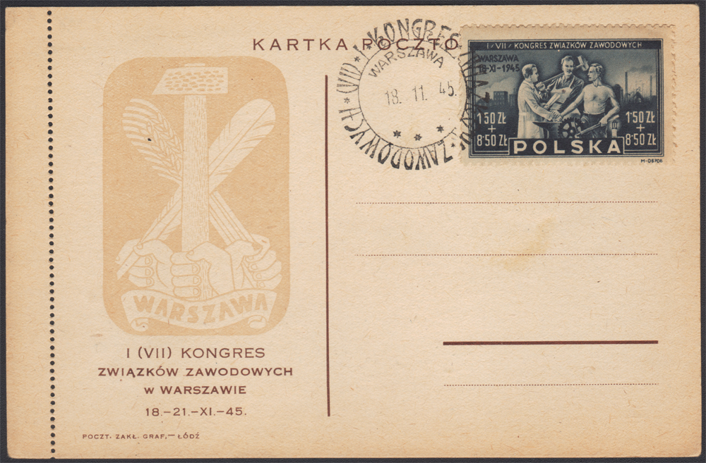 1945 VII Kongres Związków Zawodowych - znaczek skasowany 20 11 na okolicznościowej ilustrowanej karcie z perforowanym lewym marginesem o szerokości 10 mm, karty takie, również niektóre całostki (np.Wolnego Miasta Gdańska), były sporządzane, aby ułatwić ich umieszczenie w maszynach do pisania; sygnatura "POCZT. ZAKŁ. GRAF.-ŁÓDŹ"; wyjątkowo rzadki walor w dobrym stanie zachowania. | Fi.386 Mi.413 |