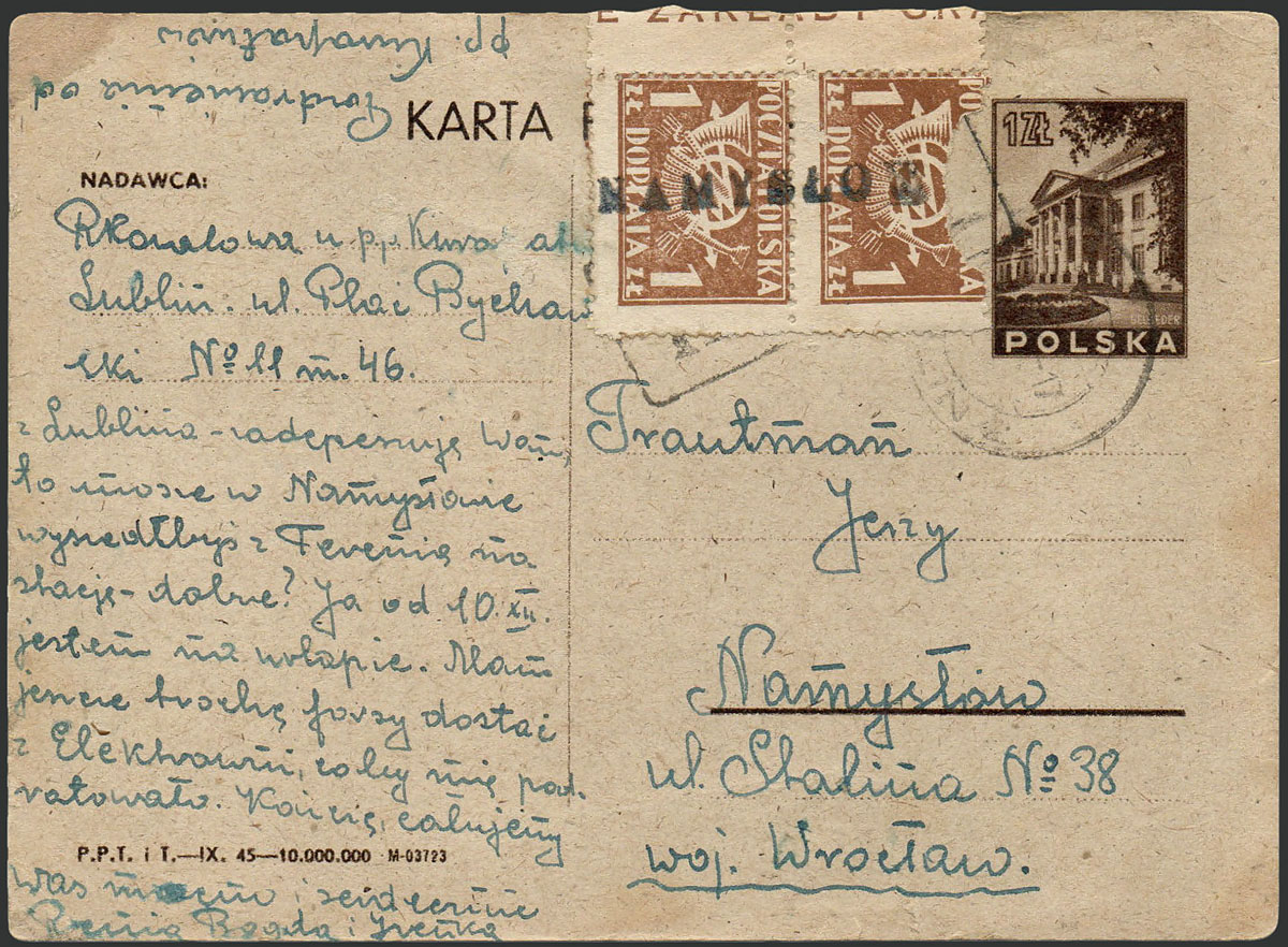 1945 kartka z Lublina do Namysłowa, z uwagi na zbyt niską opłatę urząd pocztowy adresata zastosował dopłatę, prowizoryczny stemplem "NAMYSŁÓW". | Fi.D100, Cp94 |