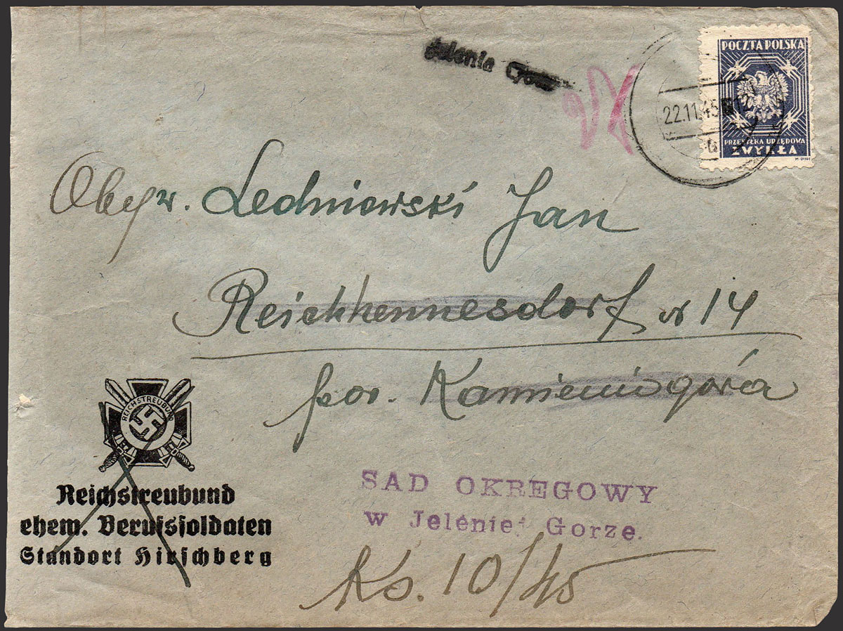 1945 list sądowy z Jeleniej Góry, znaczek skasowany prowizorycznym niemym stemplem oraz dodatkowym stemplem "Jelenia Góra". | Fi.U21II |