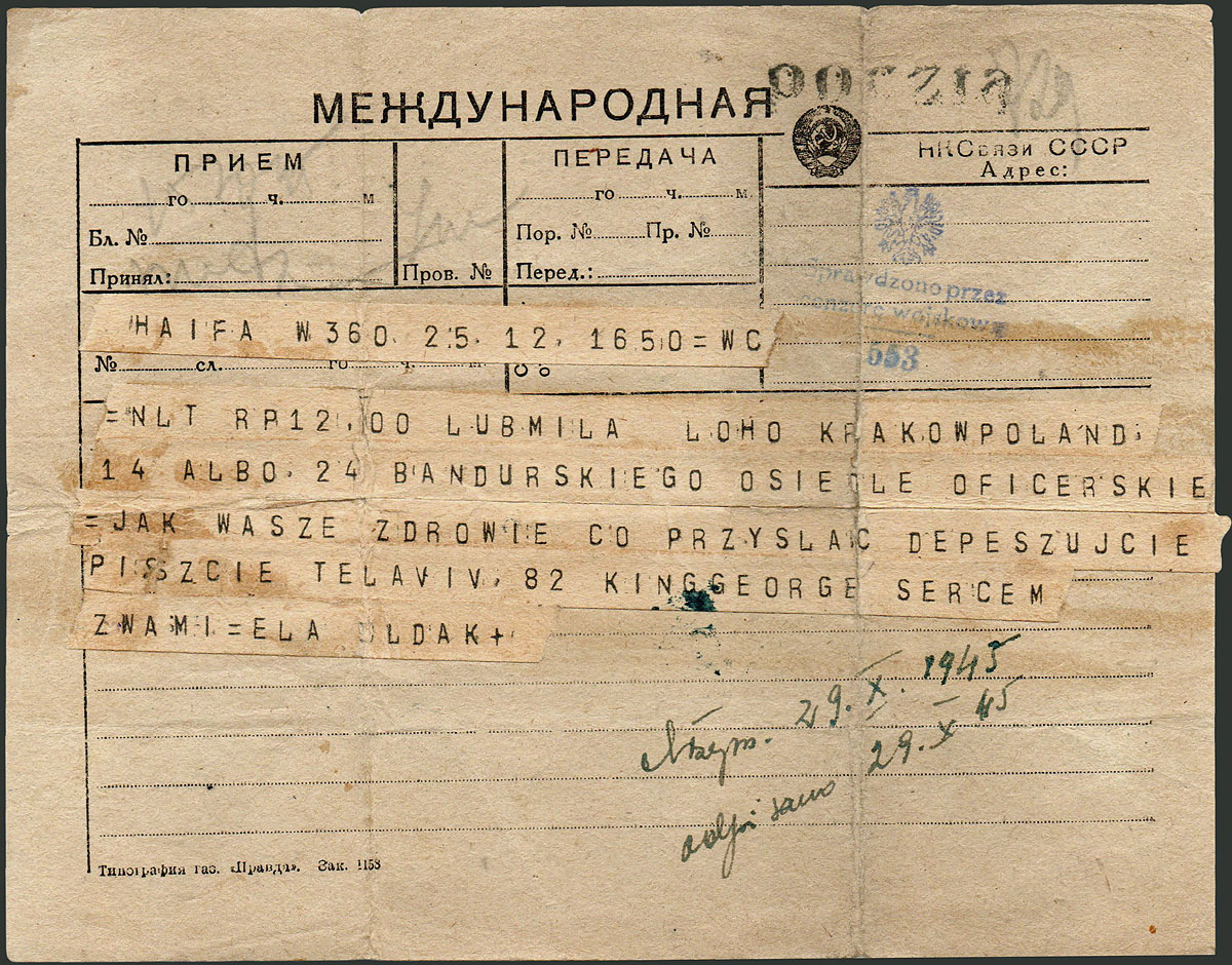 1945 unikalny telegram z Hajfy do Polski 29.10.4, radziecki formularz telegramu, stempel cenzury wojskowej nr 553. | |