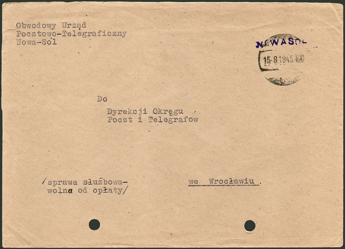 1945 list urzędowy wolny od opłaty wysłany z Nowej Soli do Wrocławia, niemy datownik i dodatkowy stempel "NOWA SÓL", dziurki po archiwizacji. | |
