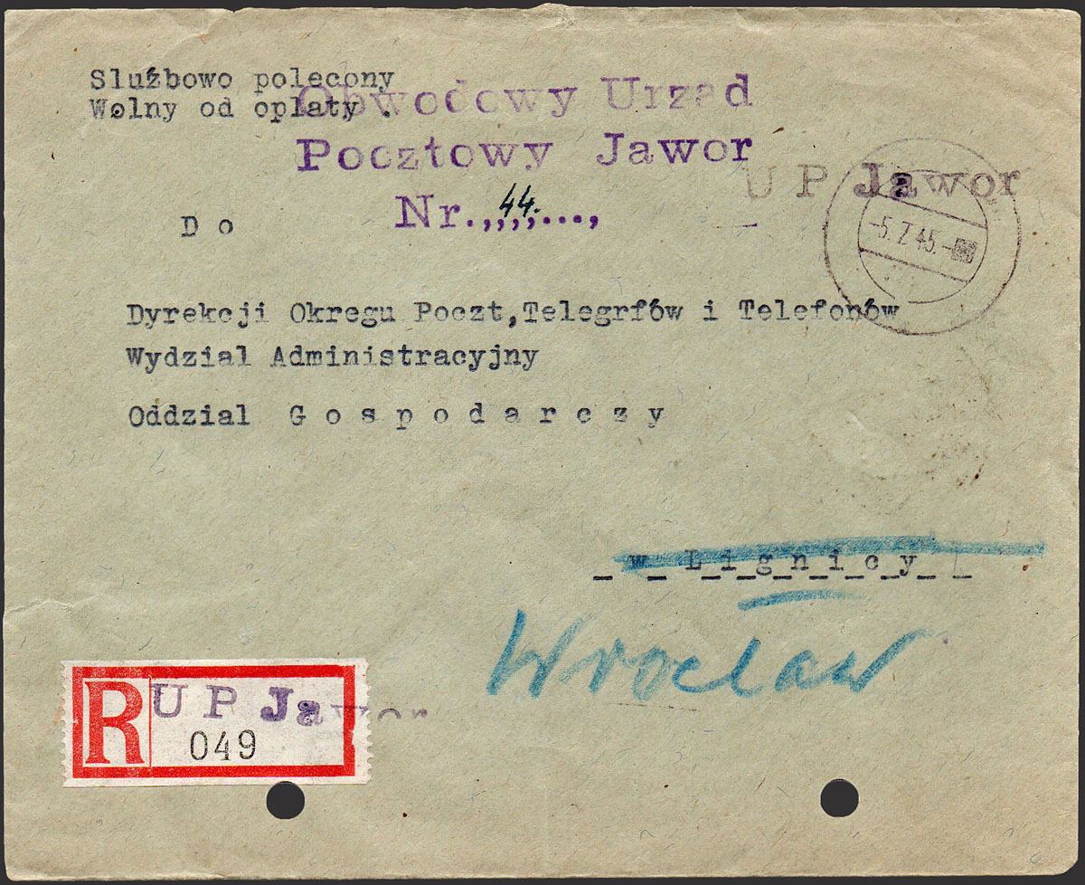 1945 polecony list urzędowy wolny od opłaty z Jawora do Lignicy, niemy datownik z dodatkowym stemplem "UP Jawor" oraz urzędowy 3-wierszowy stempel "Obwodowy Urząd / Pocztowy Jawor / Nr 44", niema naklejka polecenia z pieczątką "UP Jawor", na odwrocie stempel odbiorczy, dziurki po archiwizacji i naddarcia na rewersie. | |