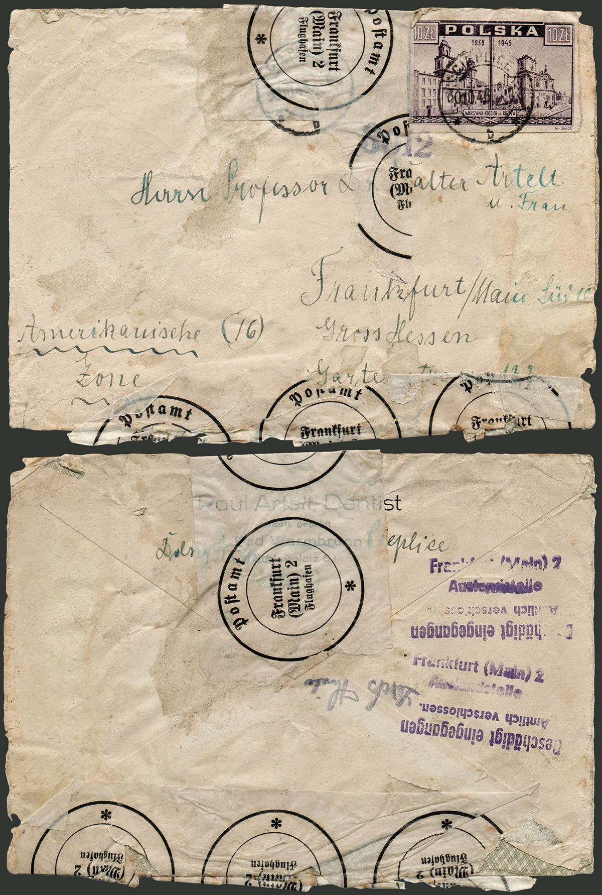 1946 list z Cieplic do Niemiec (strefa amerykańska), list w drodze uległ uszkodzeniu dlatego został zabezpieczony zaklejkami urzędu pocztowego Frankfurt (Main) 2 Flughafen. Nie można wykluczyć, że został dostarczony kombinowaną drogą lotniczą (Warszawa-Londyn i Londyn-Frankfurt ?), stempel urzędu cenzury nr 3012. | Fi.385 |
