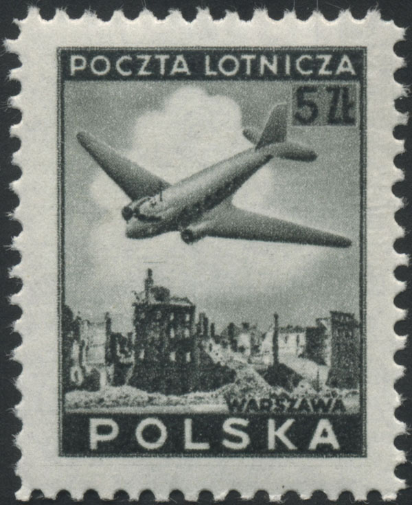 1946 wydanie lotnicze, narożny znaczek z numerem walca W.I., na górnym marginesie znaczka, powtarzalna dla tej pozycji, usterka w postaci fioletowej kropki nad literami "IC". | Fi.396 Mi.429 |