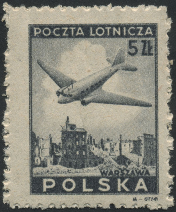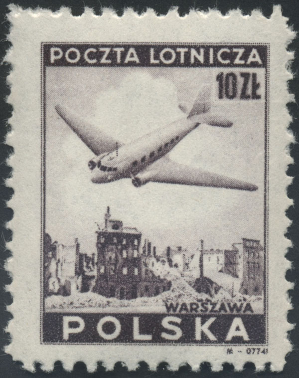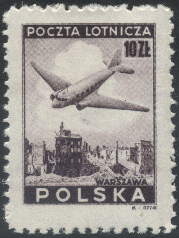 1946 wydanie lotnicze - samolot nad Warszawą, 10 zł fioletowobrązowy o rysunku kontrastowym na białym bezdrzewnym papierze z lekkim szarawym odcieniem, średnim 0,090-0,095 mm (odmiana ex2 - według artykułu p.L.Schmutza "Filatelista" 6/2018 Wydanie z 1946 roku na przesyłki lotnicze Fi.nr 395-400), ząbkowanie ZL 10¾, znaczek legitymacyjny z oznaczeniem walca N.4.W.II. - znajdującym się pod 100 znaczkiem w arkuszu, czyste; bardzo dobry stan zachowania. | Fi.395x2 Mi.429 |