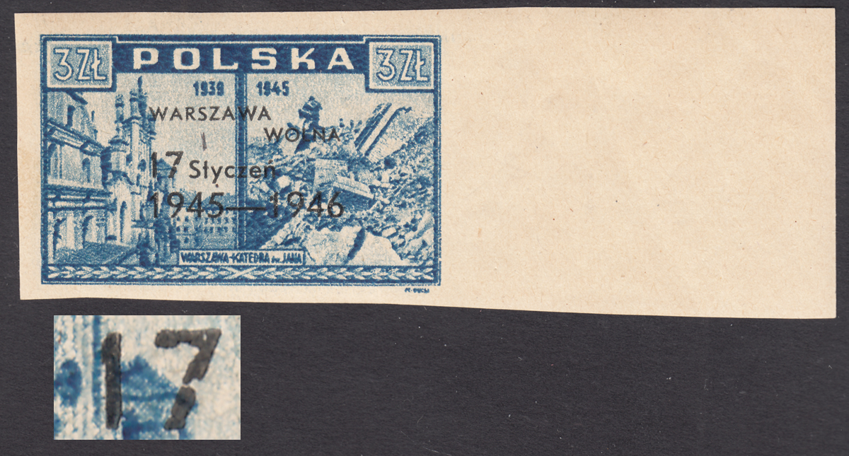 1946 1. rocznica wyzwolenia Warszawy, znaczek z nadrukiem przesuniętym i odwróconym, gwarancja i oznaczenie Walocha. | Fi.389No Mi.422K |