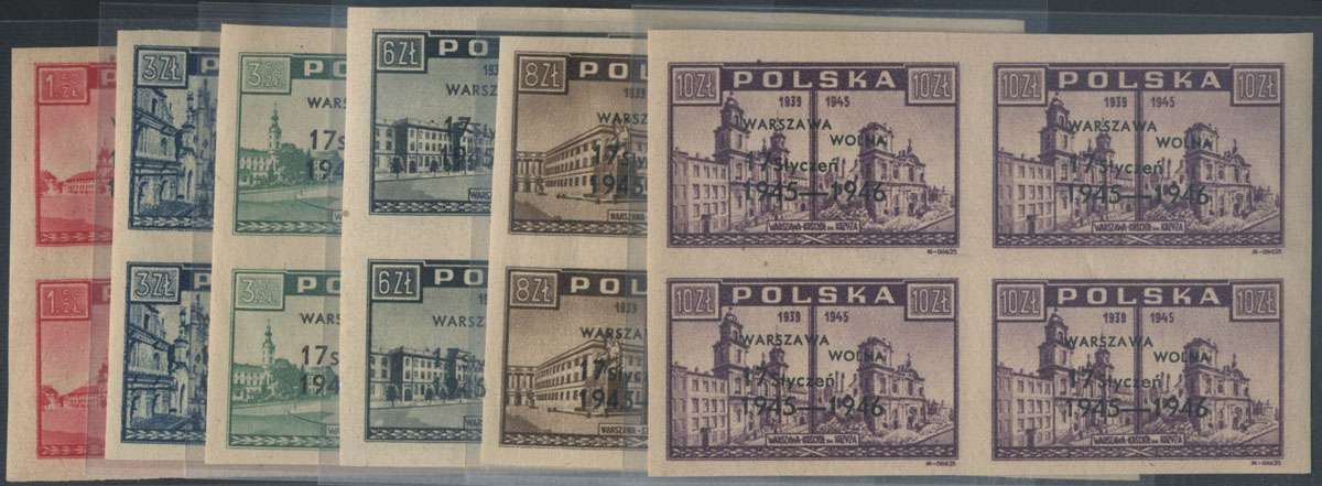 1946 Warszawa oskarża, seria w czworoblokach, na każdym czworobloku gwarancja i opis na jednym znaczku Walocha. | Fi.388-93 Mi.421-6 |