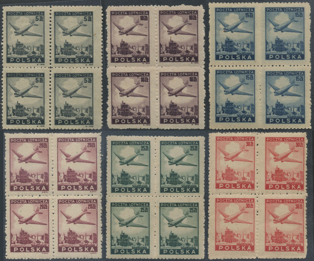 1946 wydanie lotnicze, seria w czworoblokach, znaczki w odmianach; 395Iby5, 296by5, 397ay5, 398cy2, 399ay5 i 400fy2, wszystkie z perforacją ZL 10¾A, gwarancja i oznaczenie Walocha. | Fi.395-400 Mi.428-33 |