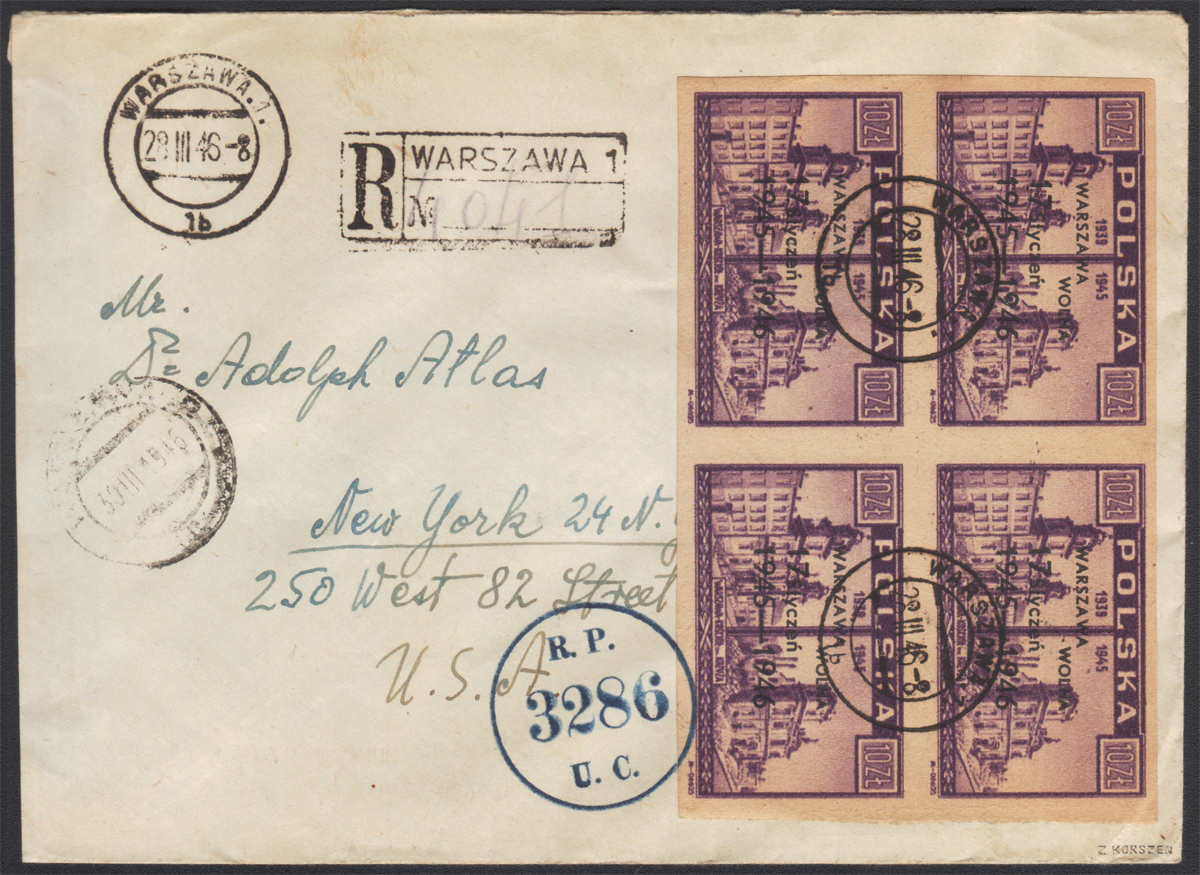 1946 rocznica wyzwolenia Warszawy, czworoblok znaczków za 10 zł z - frankatura mieszana na poleconym liście lotniczym wysłanym 28.III z Warszawy do Nowego Jorku, okrągły stempel cenzury zagranicznej z literami "R.P. i U.C." 3286, na odwrocie stemple odbiorcze; bardzo dobry stan zachowania; gwarancja. | Fi.393, 381, 384 Mi.426, 415, 418 |