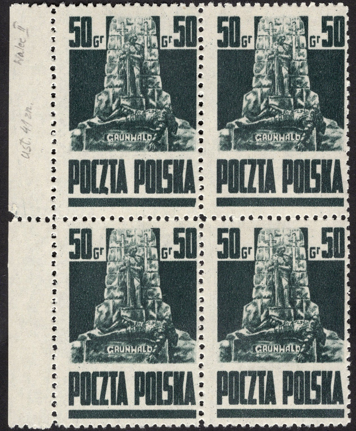 1944 Goznak, pasek makulaturowych znaczków za 50 gr. z przesuniętą w prawo perforacją pionową, gwarancja i oznaczenie MK Walocha. | Fi.343 MK Mi.384 |