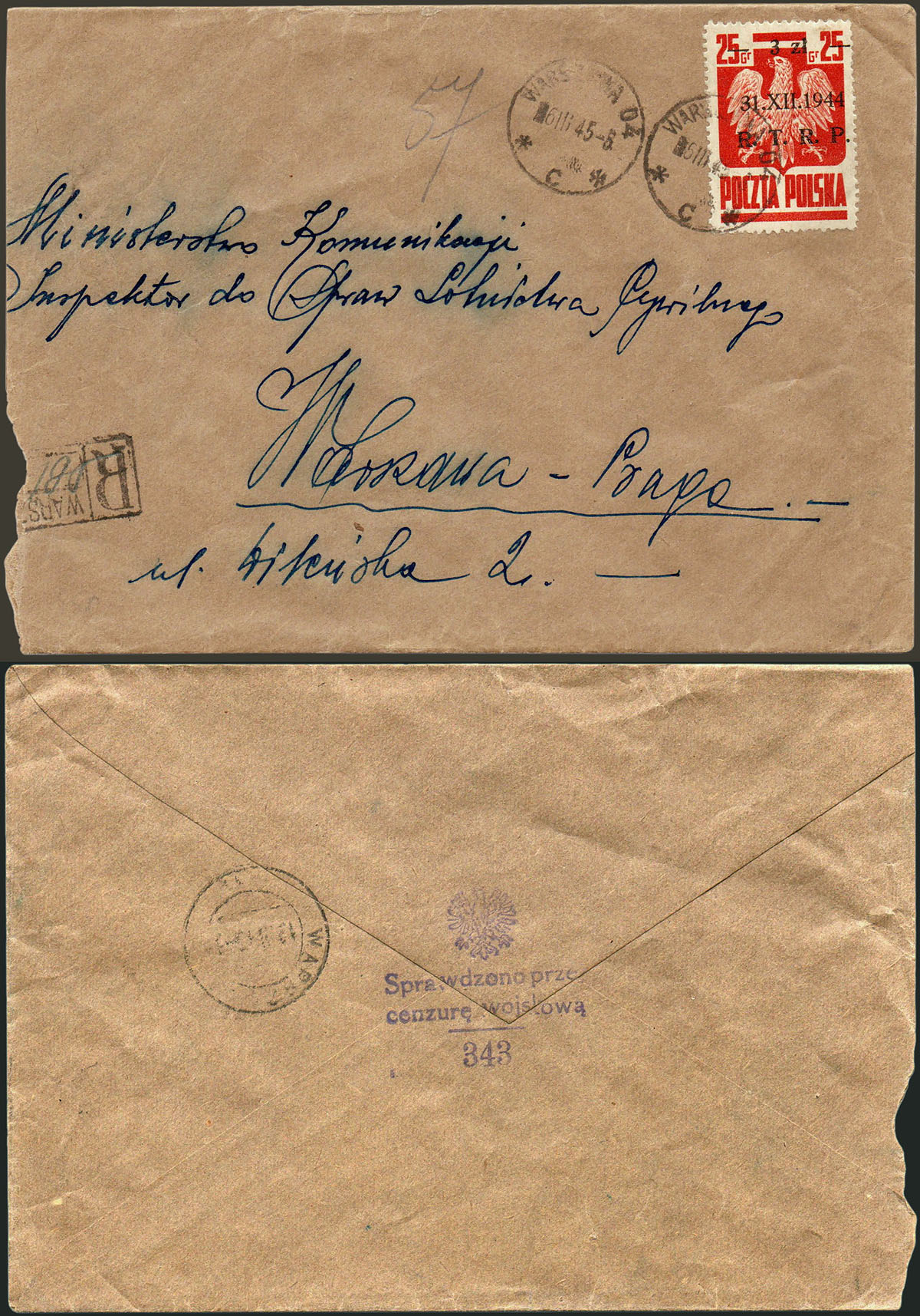 1944 R.T.R.P., miejscowy list polecony z Warszawy 4 nadany 6.03.45, na odwrocie stempel cenzury wojskowej nr 343 i kasownik odbiorczy, koperta lekko przycięta z lewej strony. | Fi.343 |