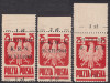 1944-45 K.R.N., P.K.W.N. i R.T.R.P., seria makulaturowych marginesowych znaczków z nadrukami przesuniętymi w górę, każdy ma dwa nominały, jeden na marginesie drugi na dole; znaczek za 1 zł./25 gr. z poz.2 ma nasunięty nominał z poz.12 i katalogowany błąd B2 "kropka po literze R ścięta z lewej" oraz "litera N uszkodzona u dołu", znaczek za 2 zł./25 gr. z poz.3 ma nasunięty nominał z poz.13 i katalogowany błąd B1 "cyfra 2 pusta w górnej części", a znaczek za 3 zł./25 gr. z poz.8 ma nasunięty nominał z poz.18, gwarancja i oznaczenie Walocha, Schmutz. | Fi.344-46 MK Mi.386-88 |