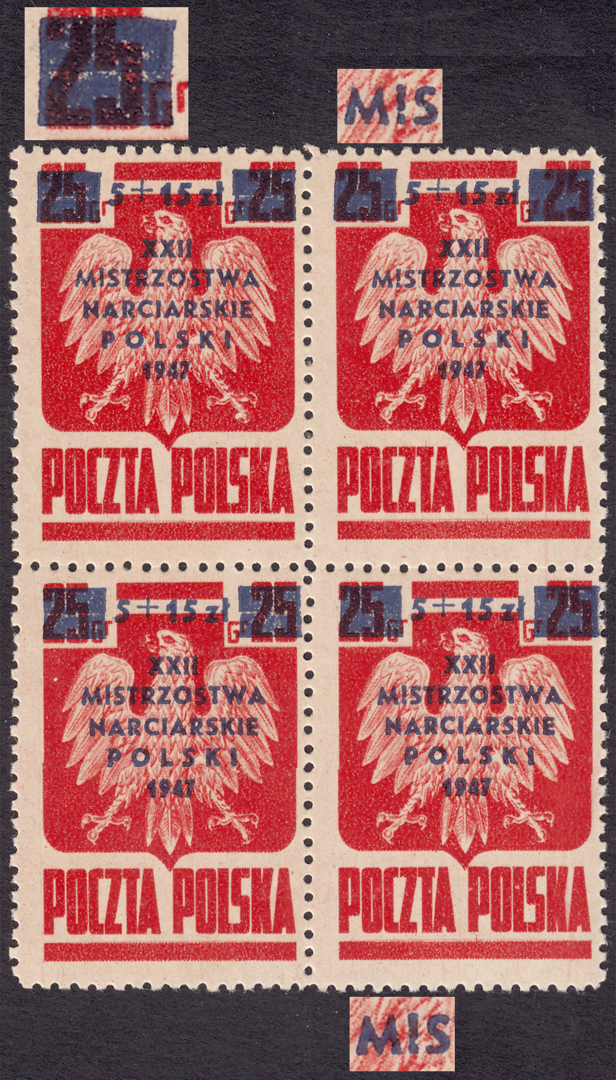 1947 XXII Narciarskie Mistrzostwa Polski, czworoblok znaczków za 5+15 zł. z trzema błędami nadruku, na lewym górnym katalogowany na poz.9/59 "ścięta górna krawędź lewego prostokąta", a na obu prawych niekatalogowane "uszkodzone I w MISTRZOSTWA", gwarancja i opis walca (III), pozycji i katalogowanego błędu Walocha. | Fi.417 B+B+B Mi.452 |