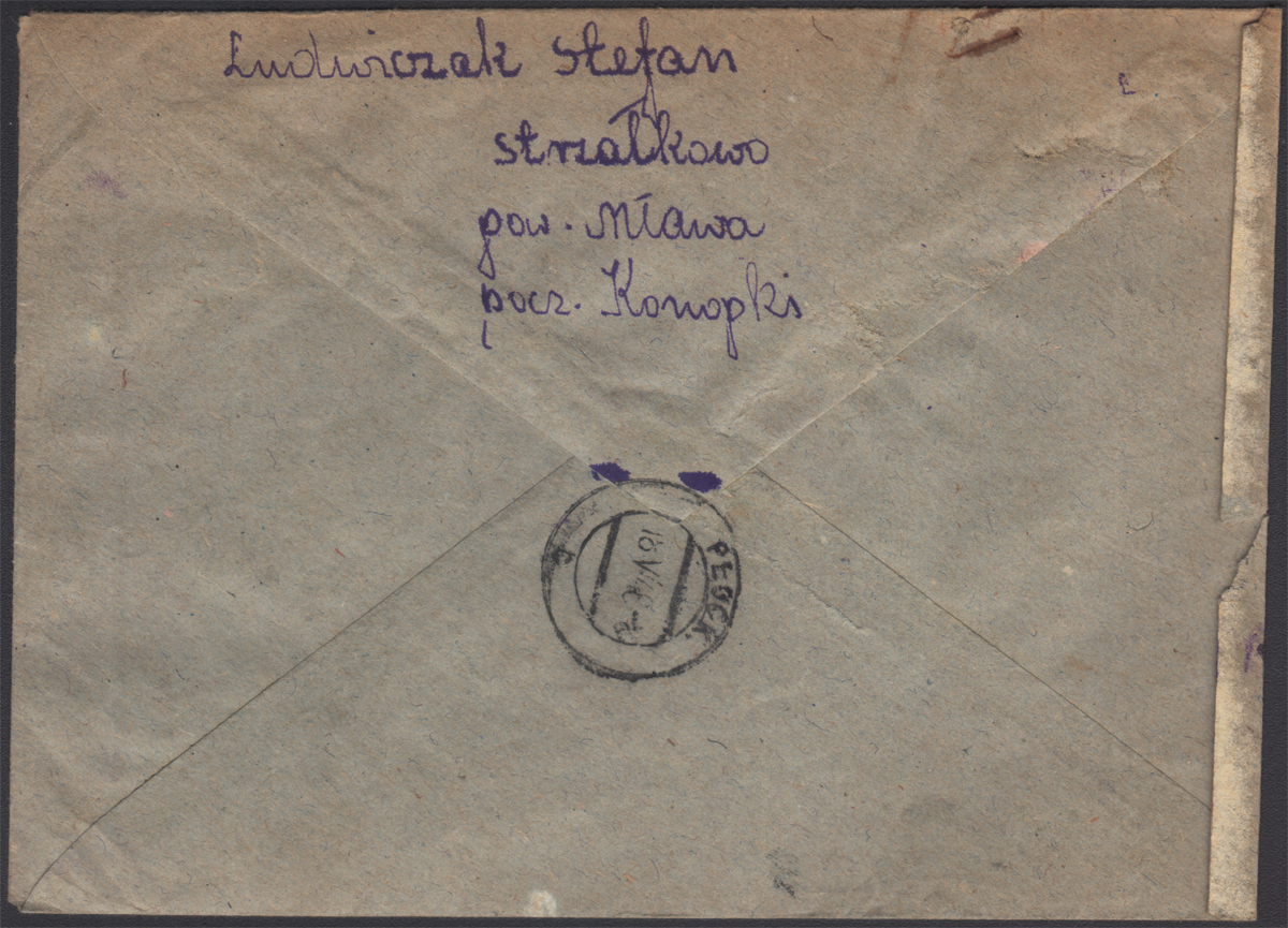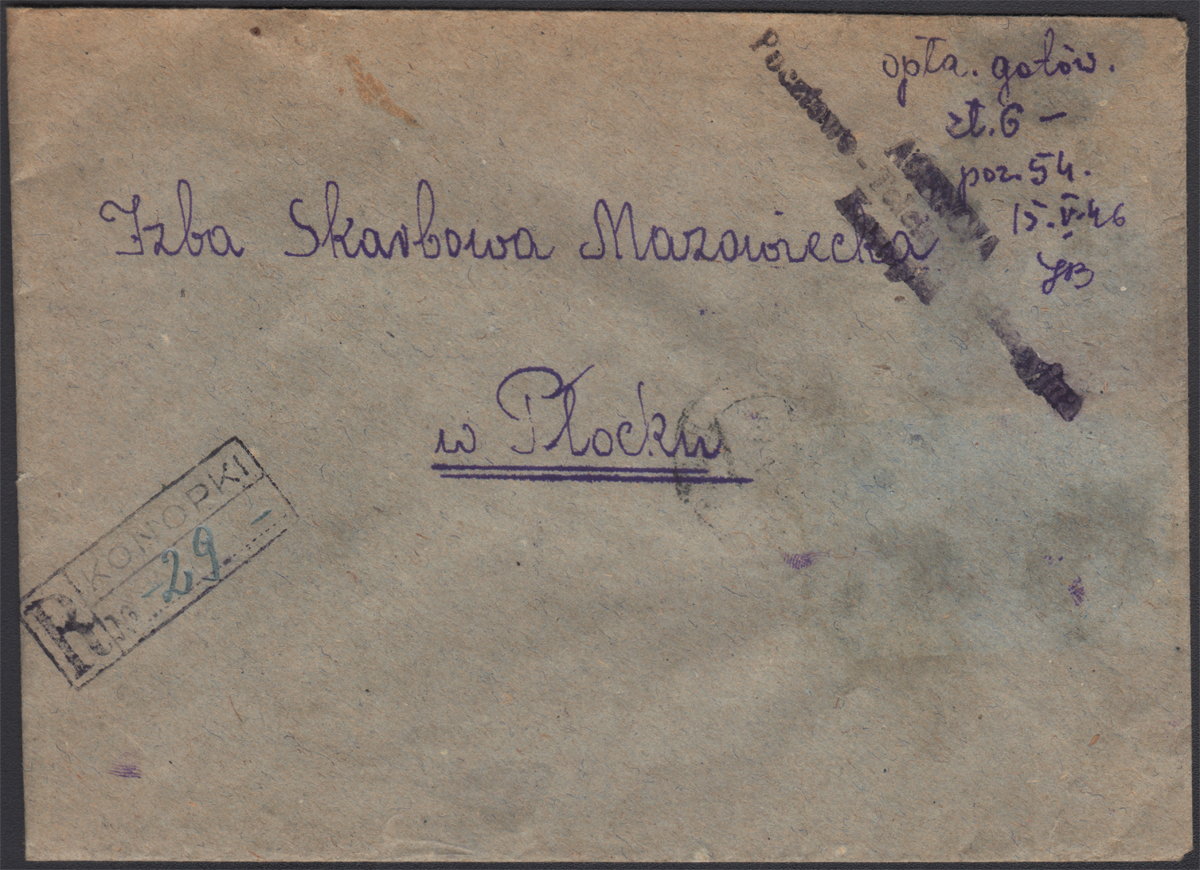 1946 KONOPKI, opłacony gotówką list polecony do Płocka, trzywierszowy stempel prowizoryczny "AGENCJA Pocztowo-Telekomunikacyjna Konopki" powyżej adnotacja ołówkiem kopiowym "opła.gotów. zł. 6 - poz.54. 15.V.46" z podpisem - K255b wg najnowszej monografii pp Z.Mąki J.Walochy i A.Kielbasy-Schoeni'ego "Znaki nadawcze używane na korespondencji w placówkach pocztowych Rzeczypospolitej Polskiej od 1944 roku", prowizoryczny przedwojenny stempelek polecenia, datownik odbiorczy na odwrocie; słabszy stan zachowania (przebarwienia, ślady archiwizacji). | |