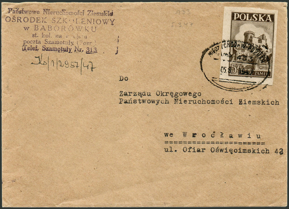 1947 list nadany w ambulansie pocztowym na trasie Wrocław - Międzylesie nr 705znaczek wydania "Będzin" z prywatnym ząbkowaniem, gwarancja Krawczyk. | Fi.408b Mi.441b |
