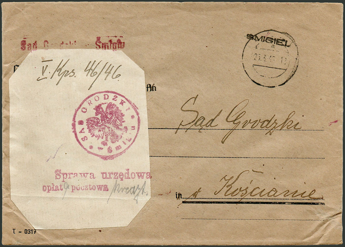 1946 list sądowy z Śmigiel do Kościana, niemy datownik pocztowy z dodatkowym stempelkiem "ŚMIGIEL". | |