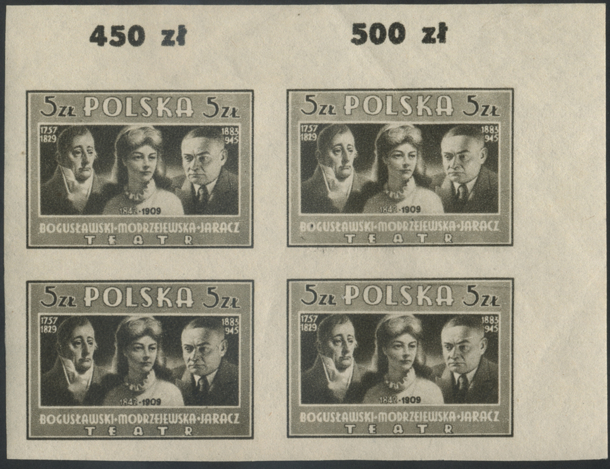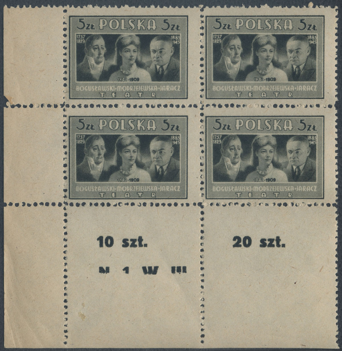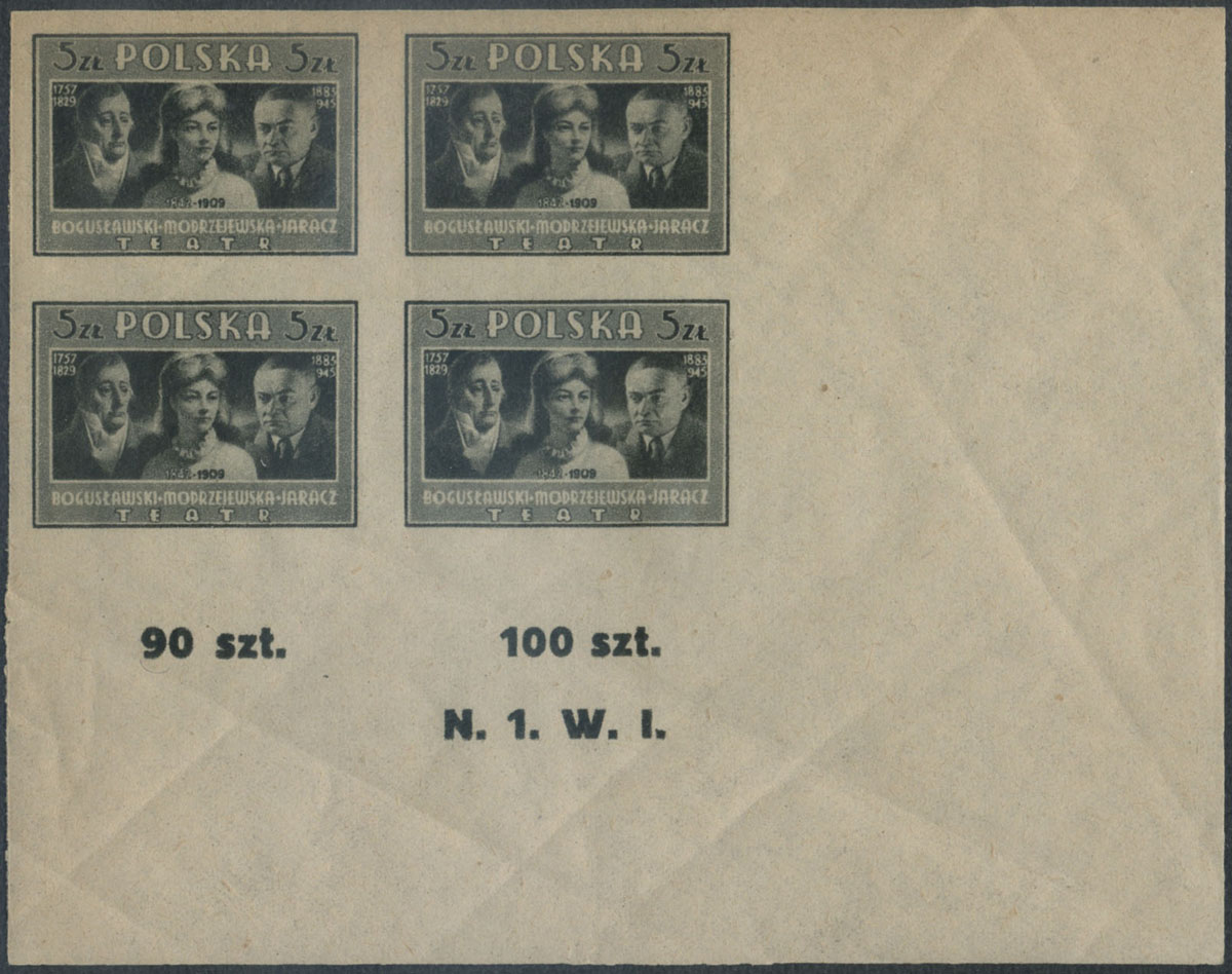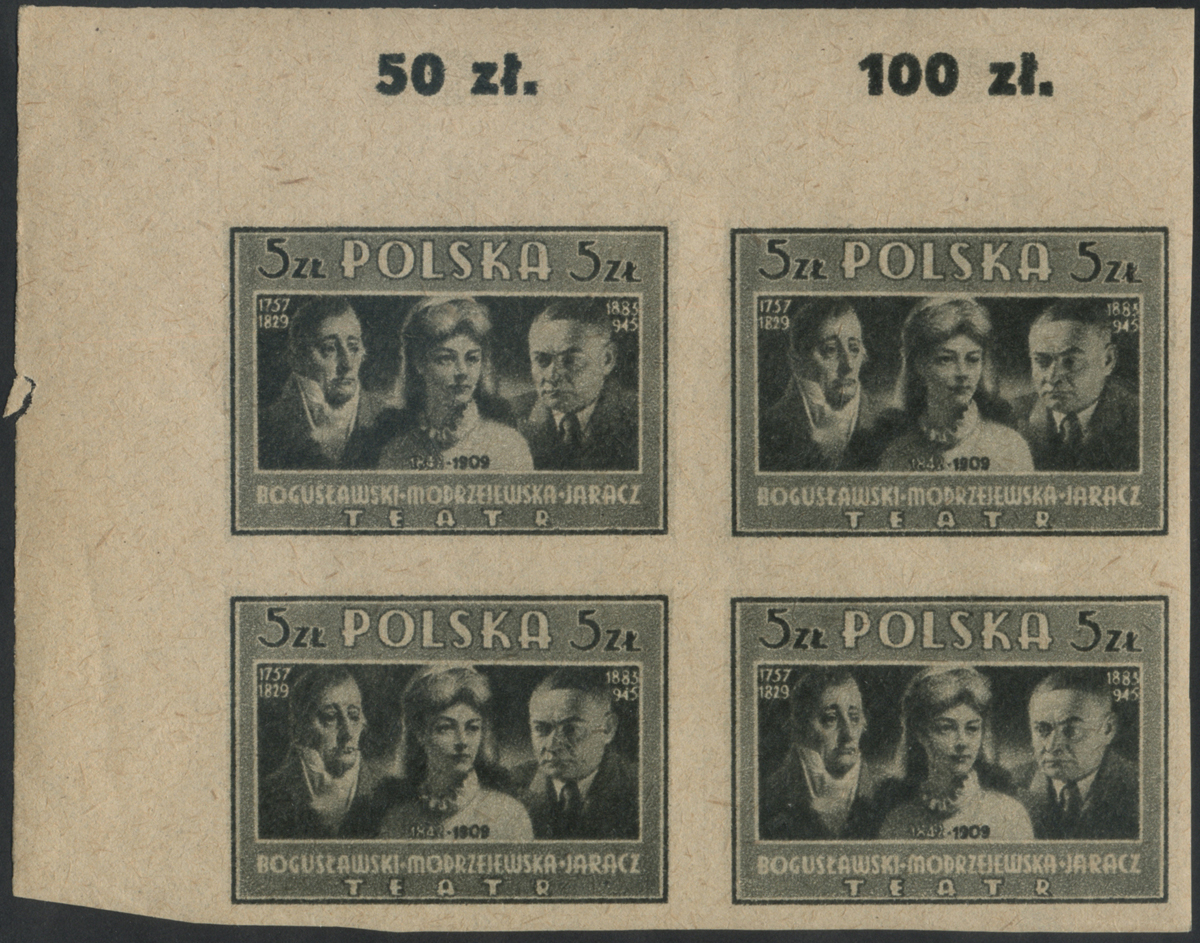 1947 Kultura Polska (I) - W.Bogusławski, H.Modrzejewska, S.Jaracz; czysty marginesowy znaczek za 5 zł. w rzadkiej niekatalogowanej odmianie koloru jasnooliwkowej o nieostrym rysunku wynikającym z wzajemnego przesunięcia druku walca konturującego (ciemnooliwkowego) i tonującego (jasnooliwkowego), widać to najlepiej po nominale, datach, napisie TEATR i ramce, białe napisy w tle są wyraźne, to rzadko spotykany rodzaj błędu, klasyczne podwójne druki tego wydania są wyceniane po kilka tysięcy złotych, gwarancja z opisem koloru i rysunku Walocha. | Fi.423B MK Mi.458A |