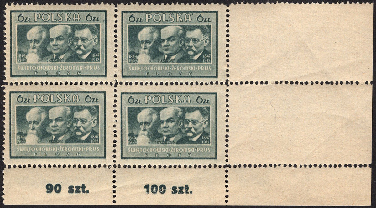 1947 kultura polska, czworoblok z błędami na trzech znaczkach, szczegółowe opisy błędów i gwarancja Więcław. | Fi.424A Mi.459A |