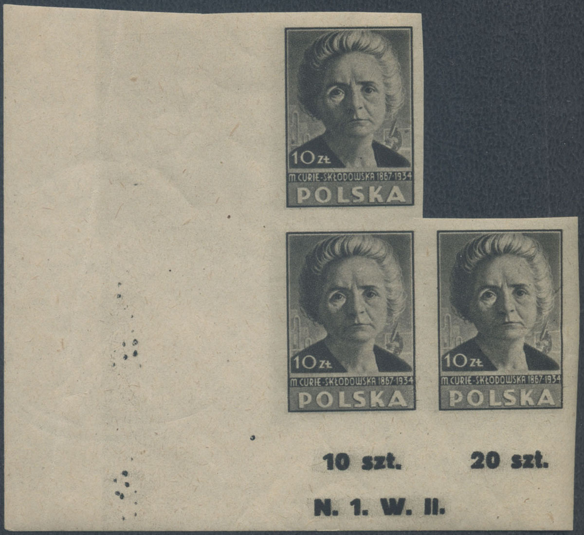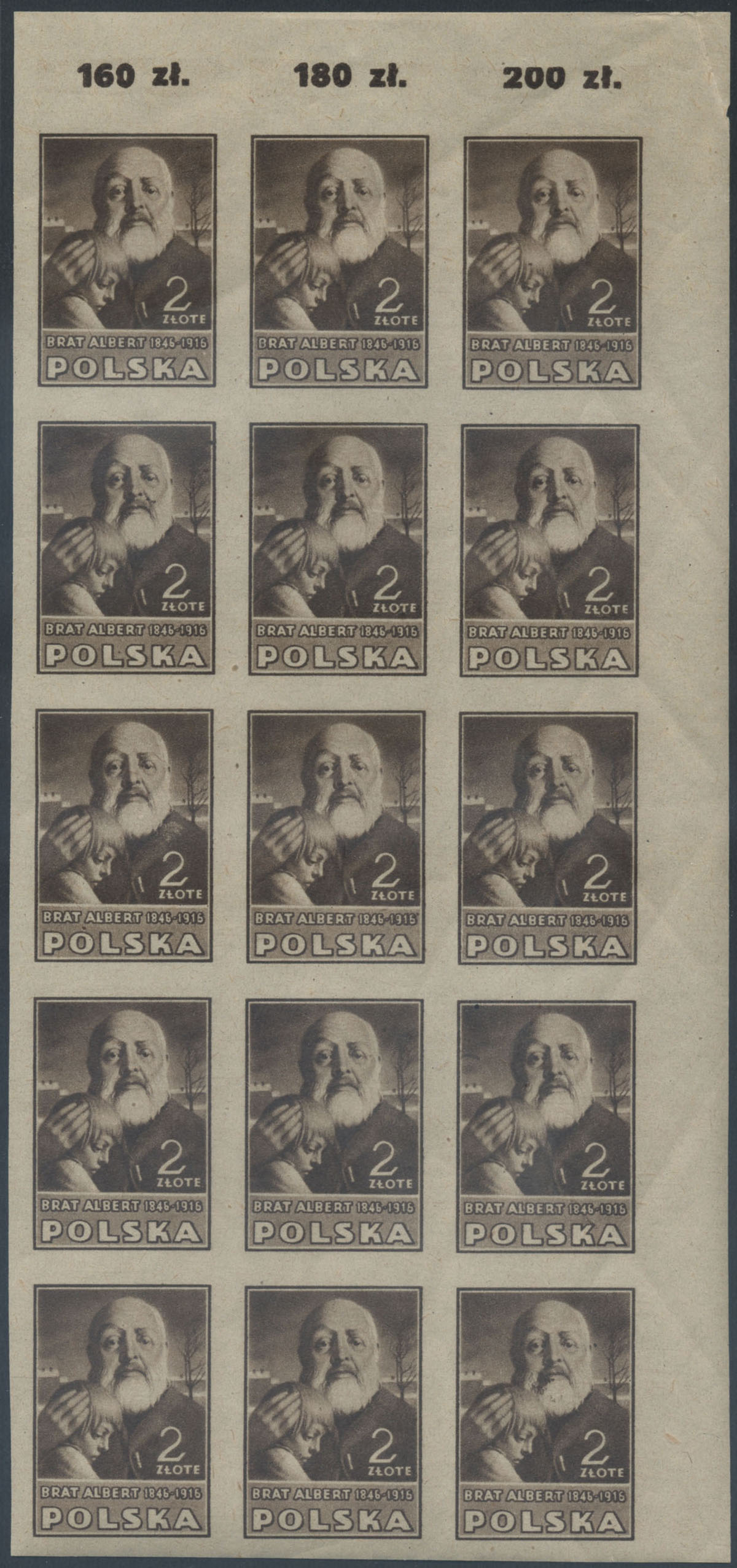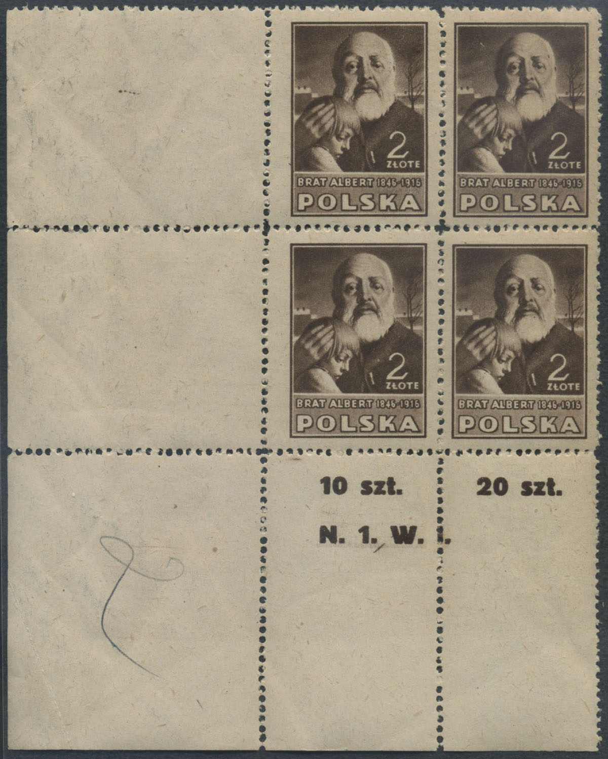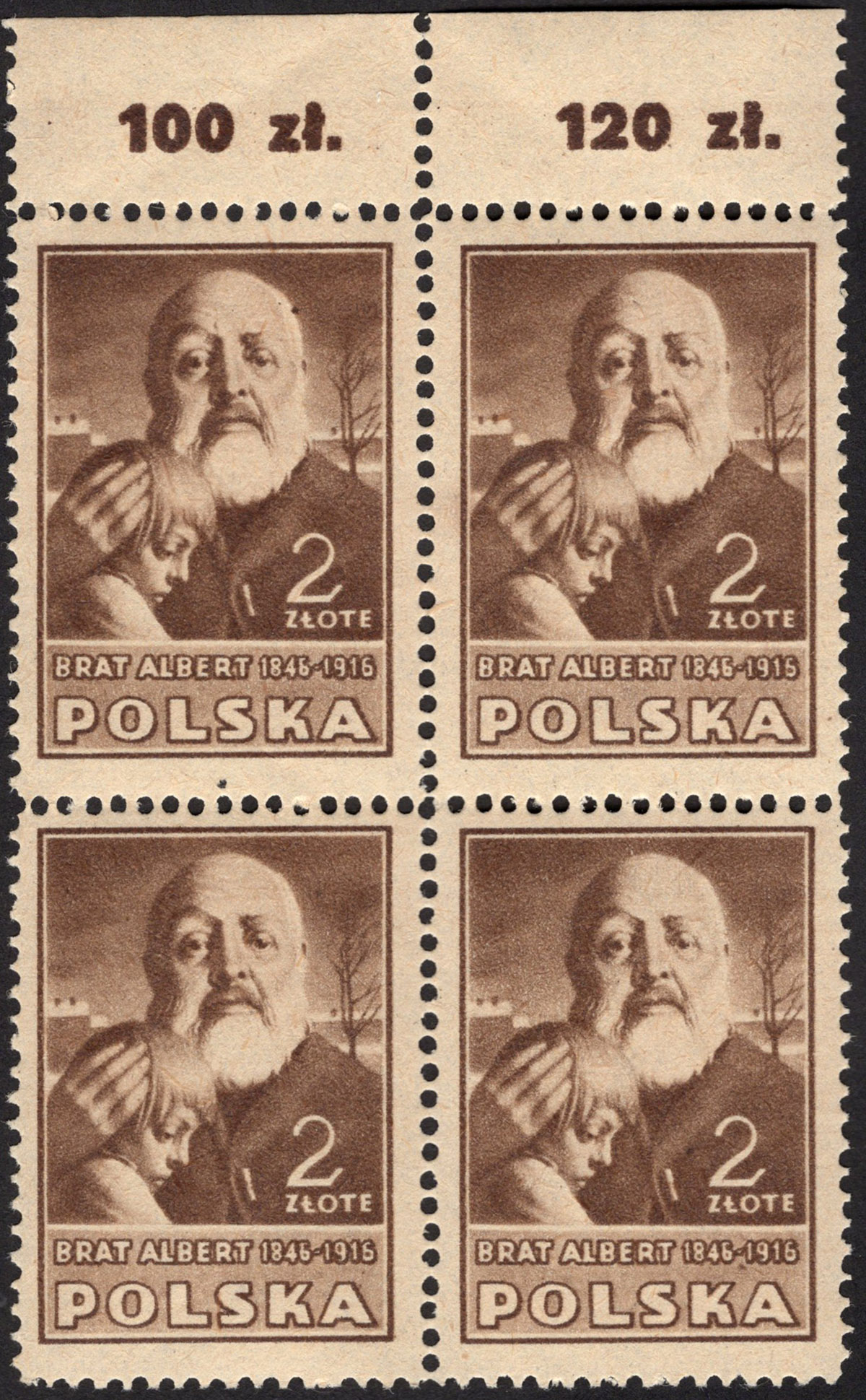 1947 Kultura polska I wydanie, 2 zł (św.Albert Chmielowski), nieząbkowane znaczki z w marginesowej parce poziomej, prawy z błędem na poz.50 "plamka na brodzie"; gwarancja i opis. | Fi.421A B2 Mi.456B |