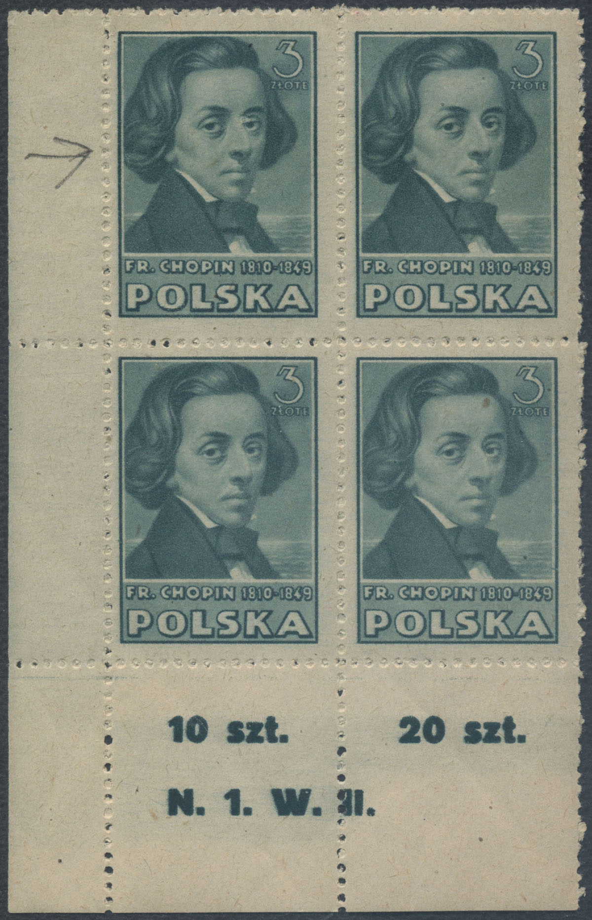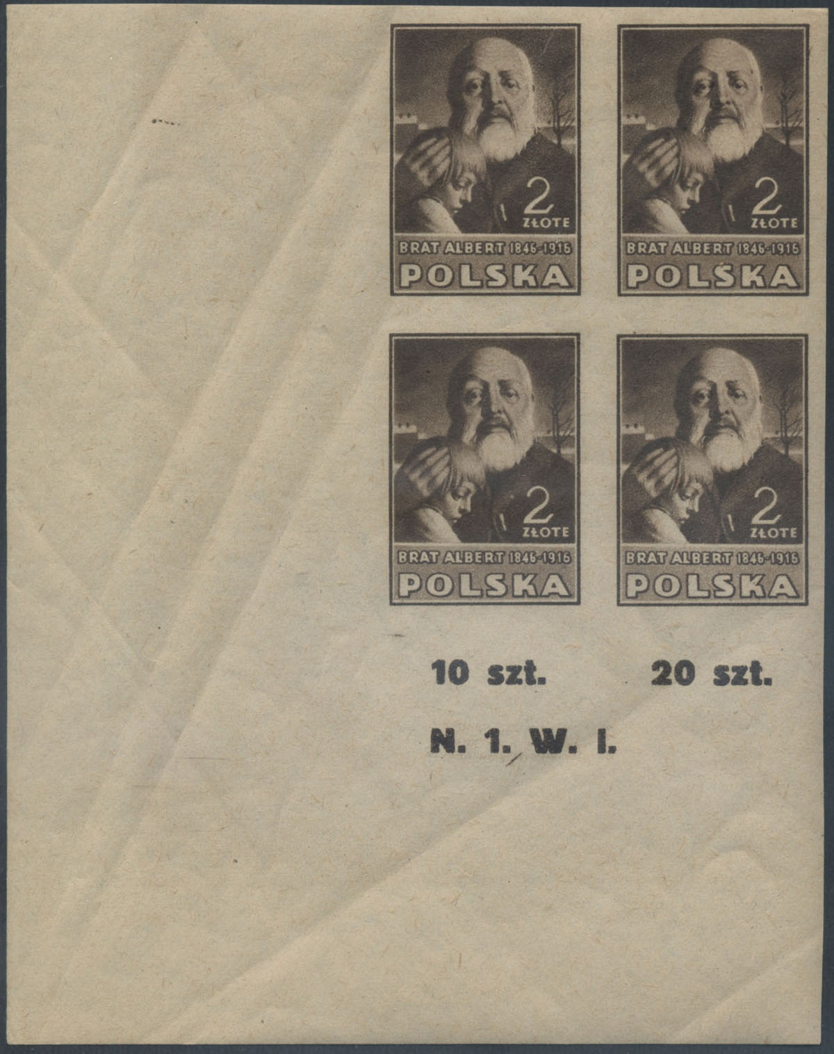 1947 kultura polska, blok legitymacyjny znaczków w barwie żółtobrązowej z numerem walca na dolnym marginesie, gwarancja i opis na jednym znaczku Walocha. | Fi.421B Mi.456A |
