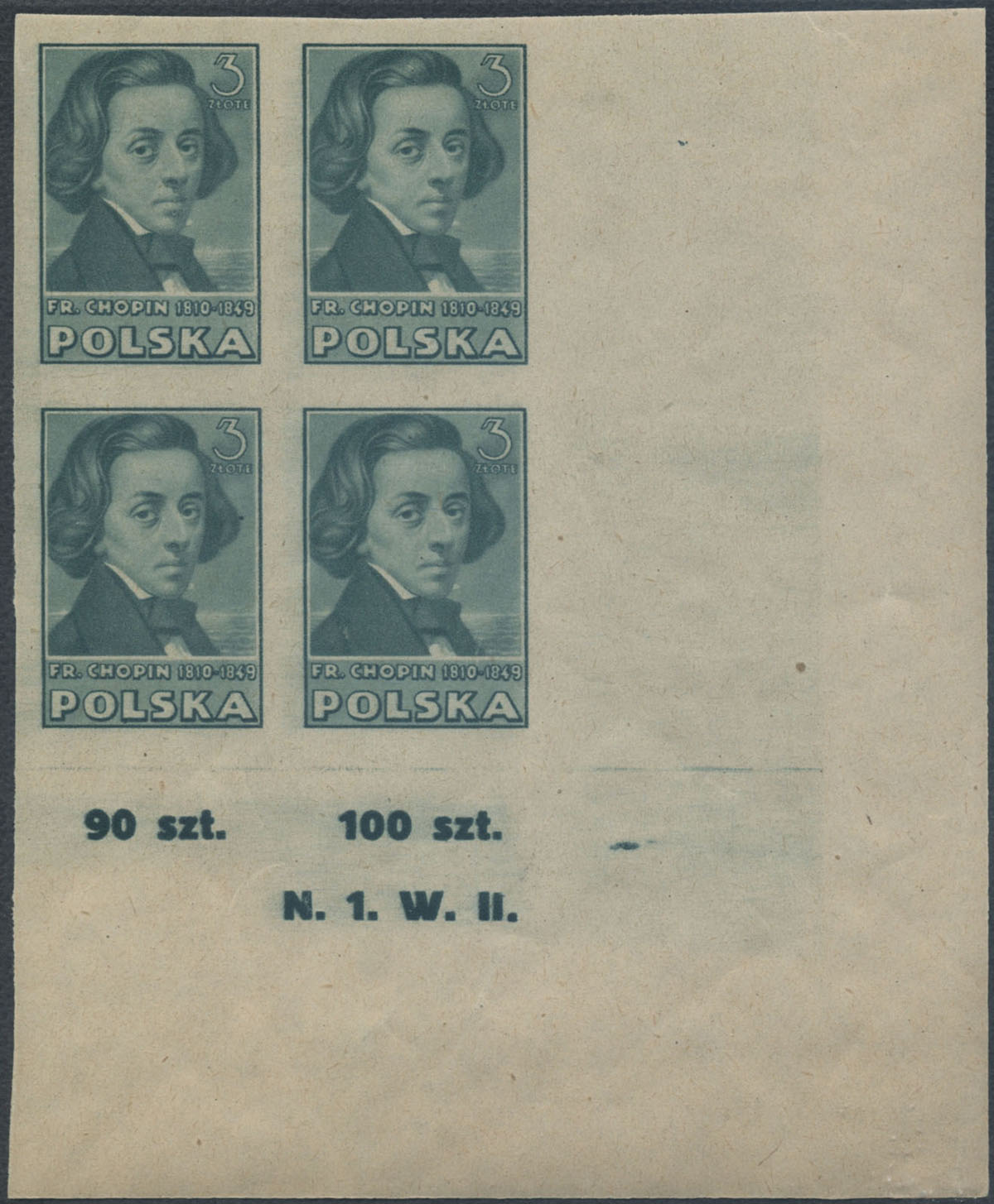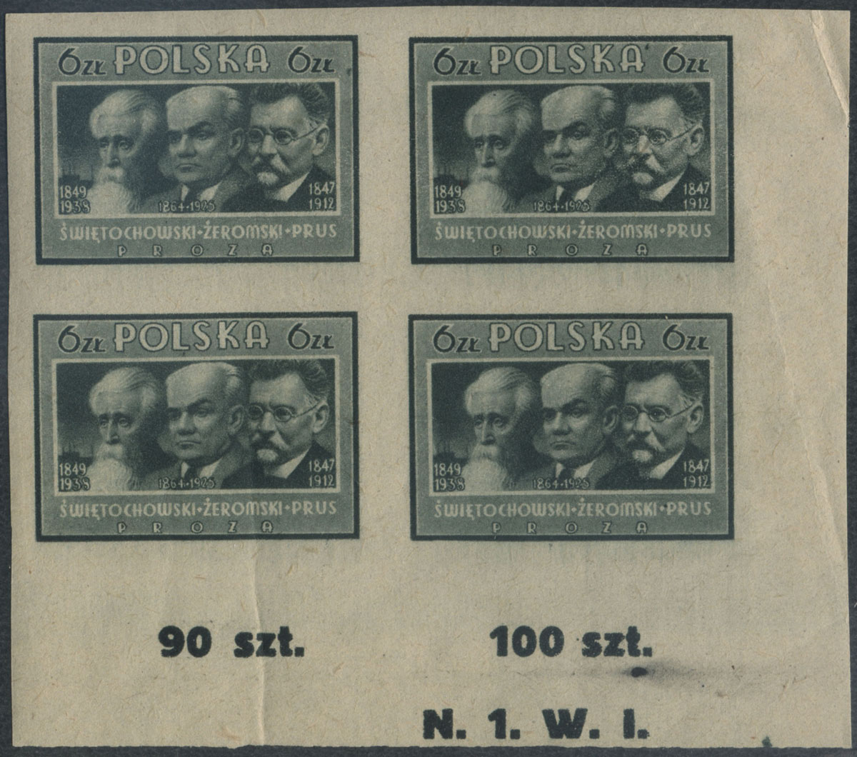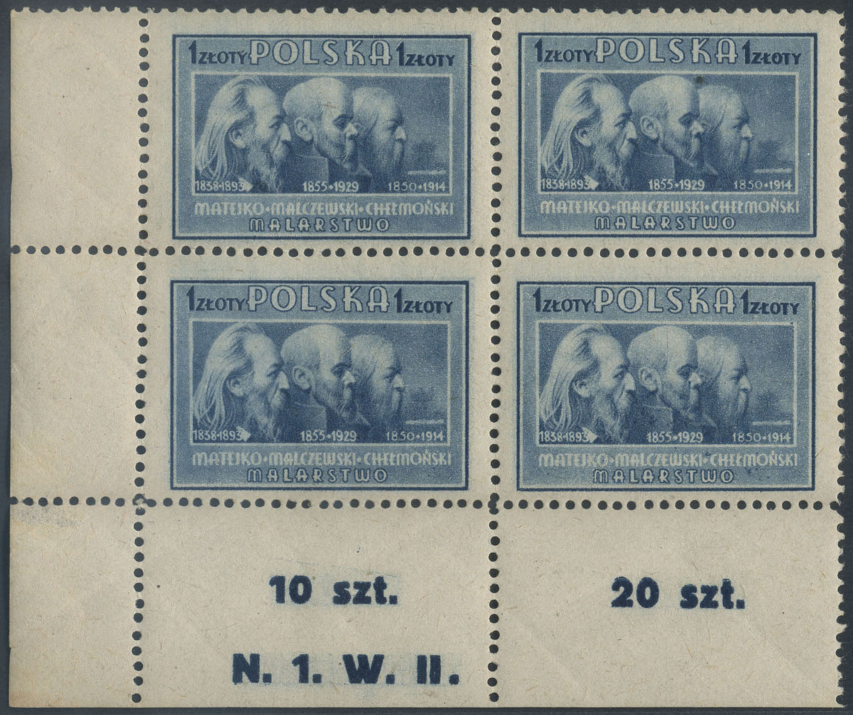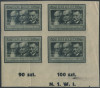 1947 kultura polska, czworoblok znaczków w barwie czarnooliwkowej na papierze średnim, gwarancja i opis na jednym znaczku Walocha. | Fi.423A Mi.458B |