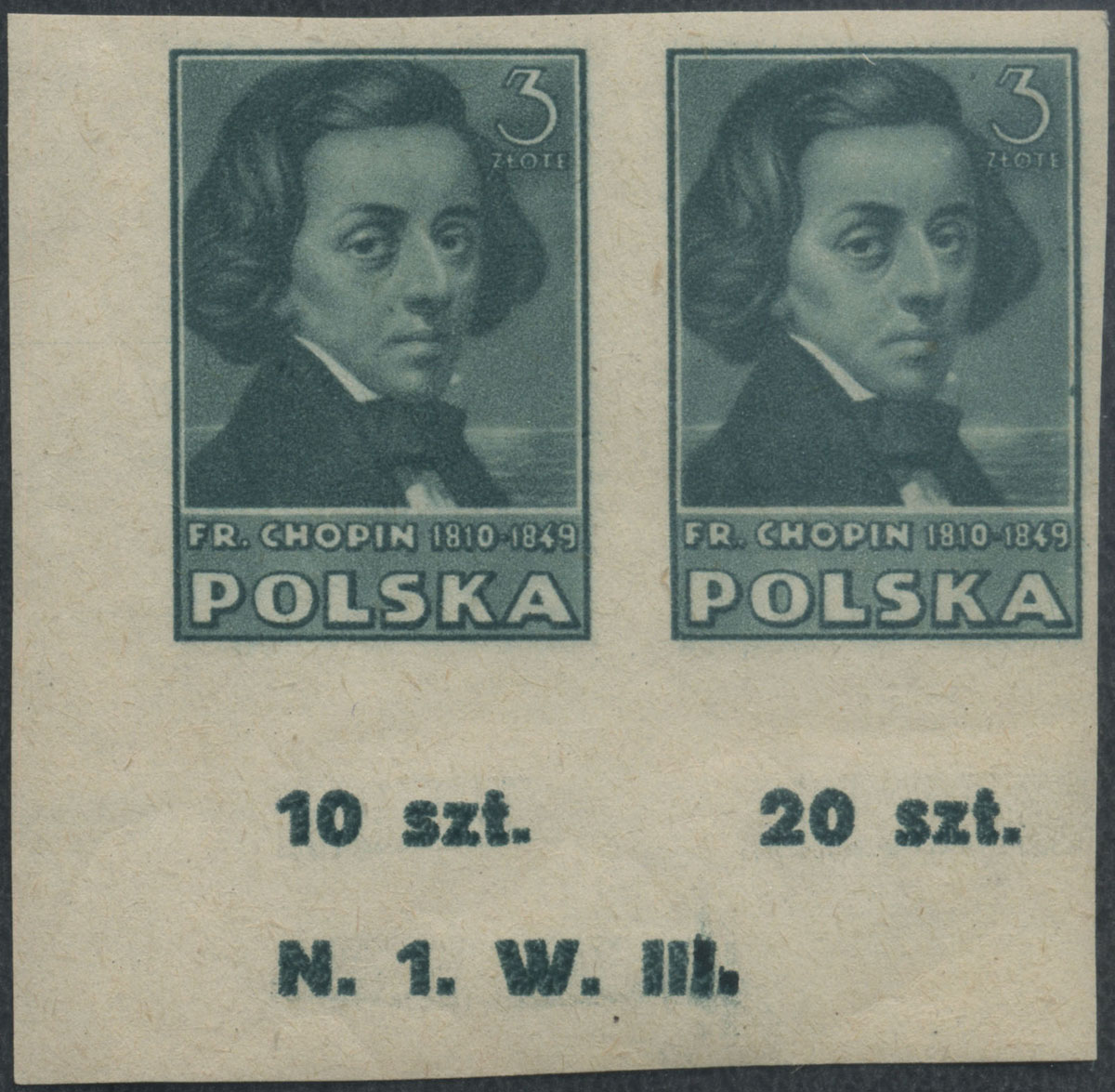 1947 kultura polska, narożna parka znaczków z numerem walca na dolnym marginesie, znaczki w barwie szaroniebieskiej, gwarancja i opis na jednym znaczku Walocha. | Fi.420B Mi.465A |