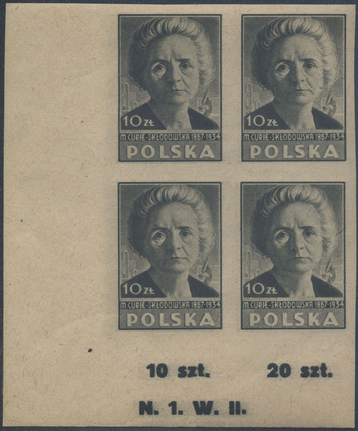 1947 kultura polska, wieloblok z numerem walca na dolnym marginesie, znaczki w barwie szaroczarnej, gwarancja i opis na jednym znaczku Walocha. | Fi.425A Mi.460B |