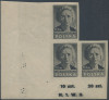 1947 Kultura Polska I wydanie, Malarstwo - ząbkowany znaczek za 1 zł, pasek poziomy trzech sztuk z górnym marginesem, środkowy z błędem na poz.4 "kropka na czole Chełmońskiego", prawy z błędami na poz.5 "kropka na włosach i nad głową Matejki"; bardzo dobry stan zachowania; gwarancja. | Fi.420B B+B Mi.455A |