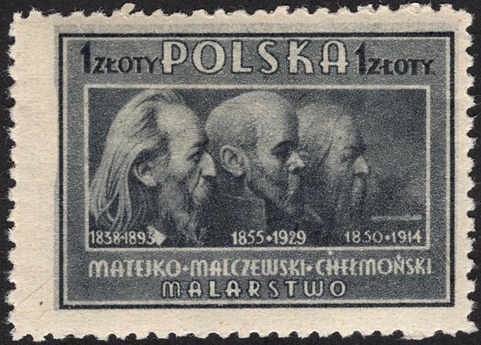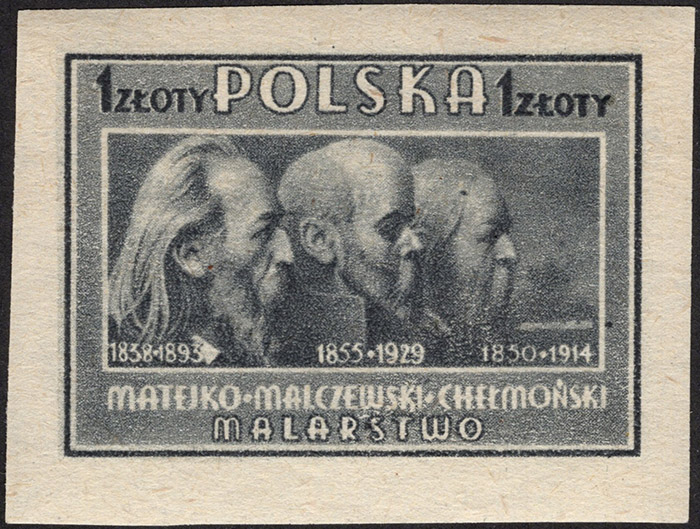 1947 kultura polska, znaczek z błędem "plama na brodzie Matejki", fragment numeru walca na dolnym marginesie lekko rozerwanym, opis i gwarancja Więcław. | Fi.429B B1 Mi.463A |