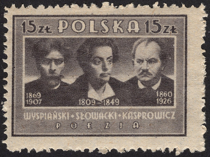 1947 kultura polska, znaczek z błędem "plama przy Ł w SŁOWACKI", opis i gwarancja Więcław. | Fi.426B Mi.435A |