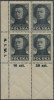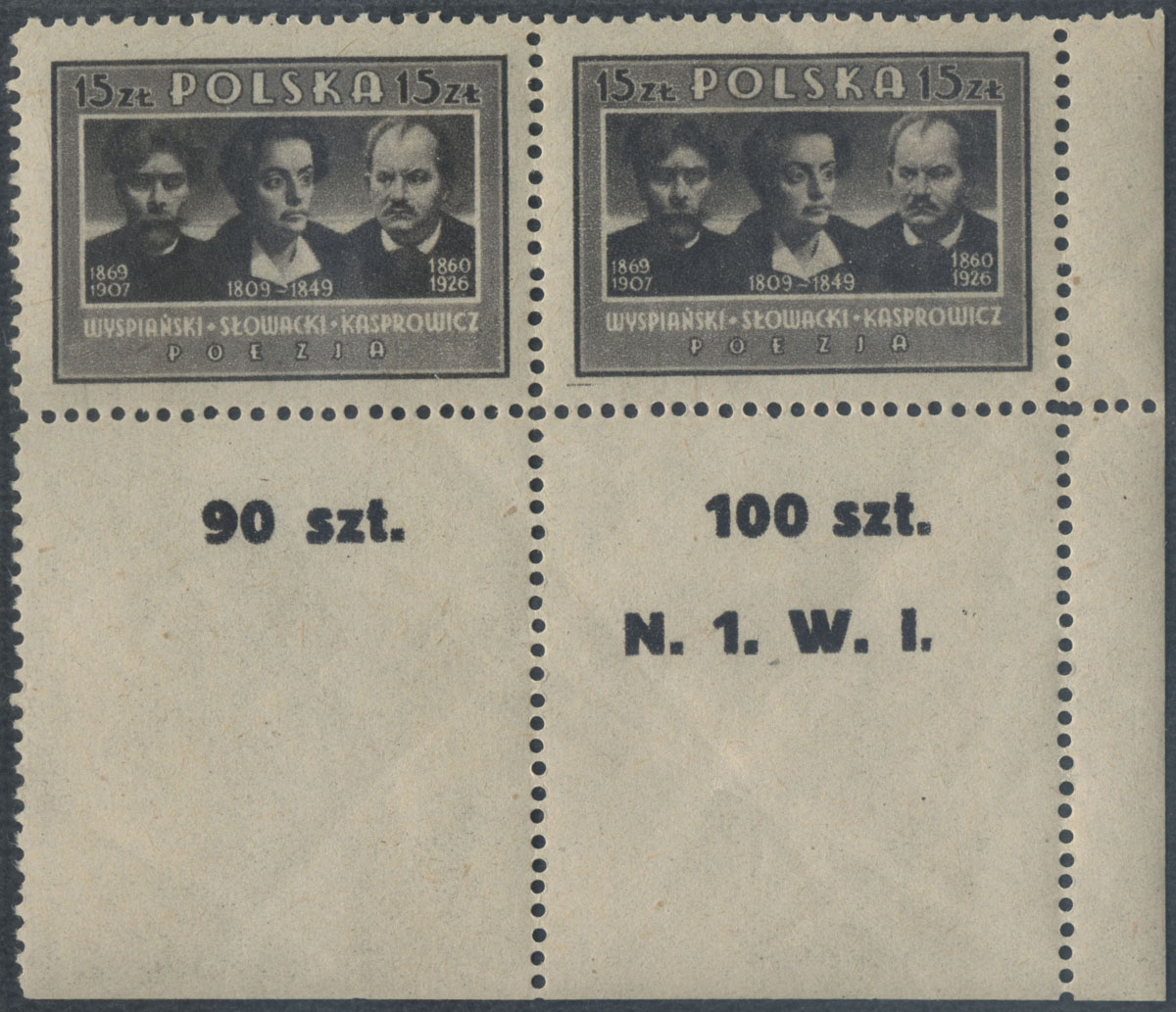 1947 kultura polska, narożna parka z numerem walca na dolnym marginesie, znaczki w barwie niebieskawoszarej z nieostrym rysunkiem na papierze x, gwarancja i opis na jednym znaczku Walocha. | Fi.429A Mi.463B |
