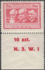 1947 Kultura polska II wydanie, Maria Skłodowska - ząbkowany znaczek legitymacyjny za 10 zł z oznaczeniem walca N.2.W.III. - znajdującym się za 10 znaczkiem w arkuszu, widoczny powtarzalny błąd "kropka po A w POLSKA", na odwrocie na części powierzchni wyraźna drugostronna przebitka druku (abklatsch); bardzo dobry stan zachowania. | Fi.434B Mi.468A |