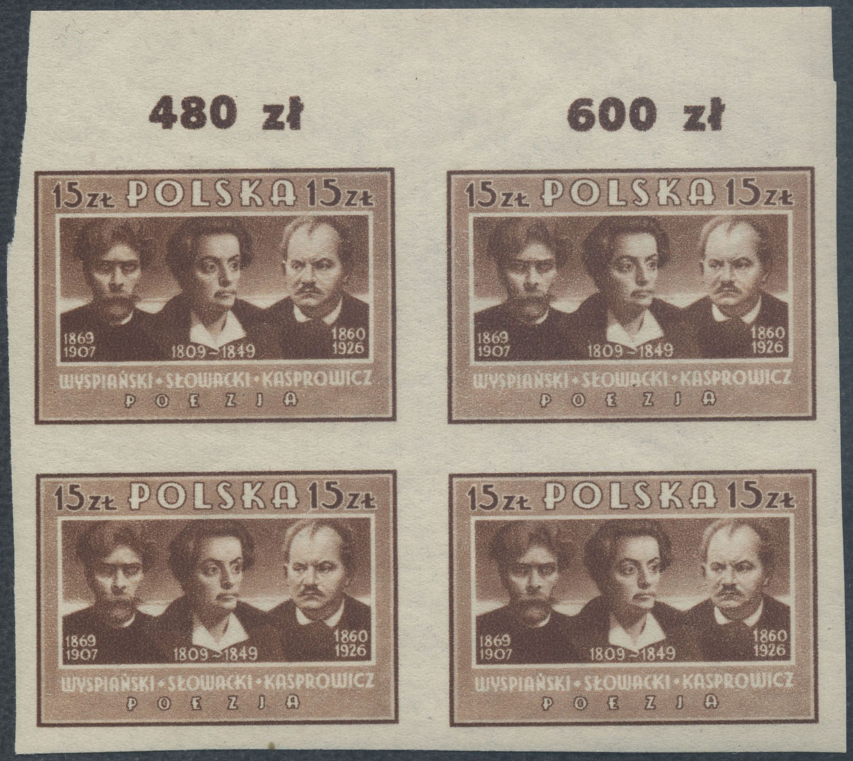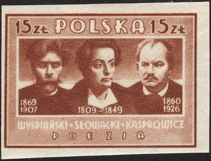 1947 Kultura polska II wydanie - S.Wyspiański, J.Słowacki, J.Kasprowicz, cięty znaczek za 15 zł. o podwójnym druku i co niespotykane wzajemnie przesuniętym poziomo - pokazano to na szczegółach, bardzo ładny stan zachowania, to jeden z rzadszych błędów Polski Ludowej, gwarancja Bojanowicz. | Fi.435A Dp Mi.469B DD |