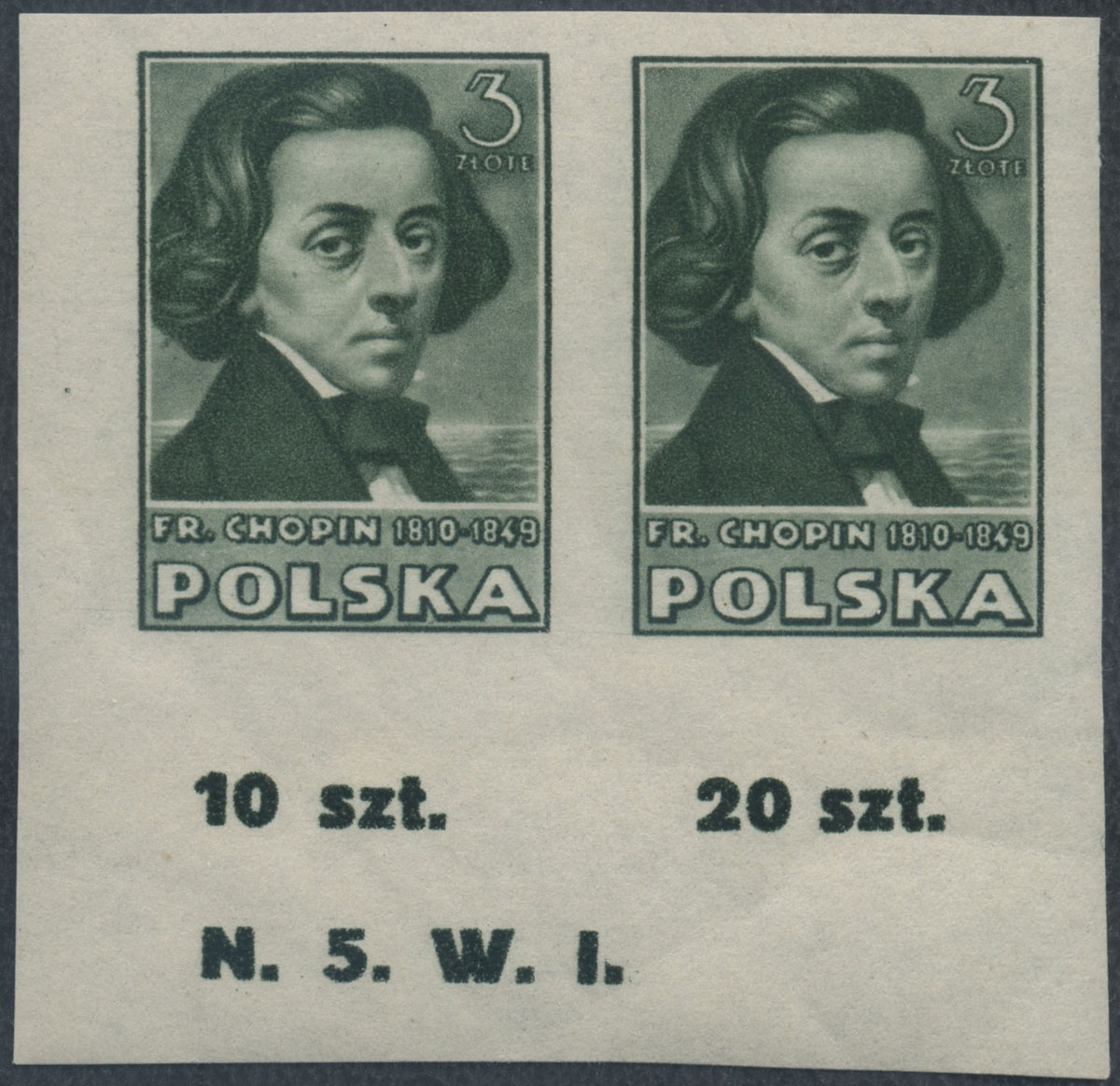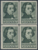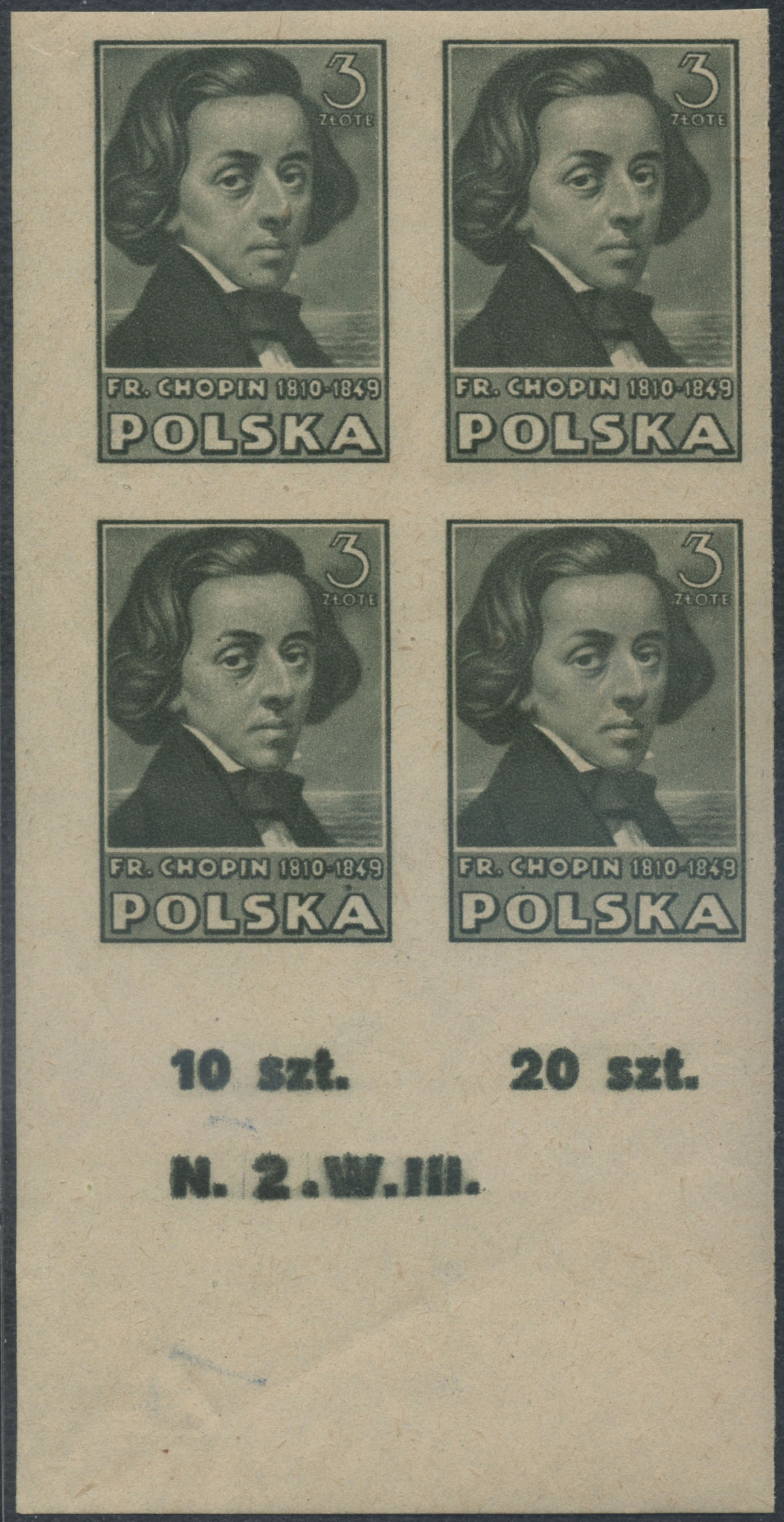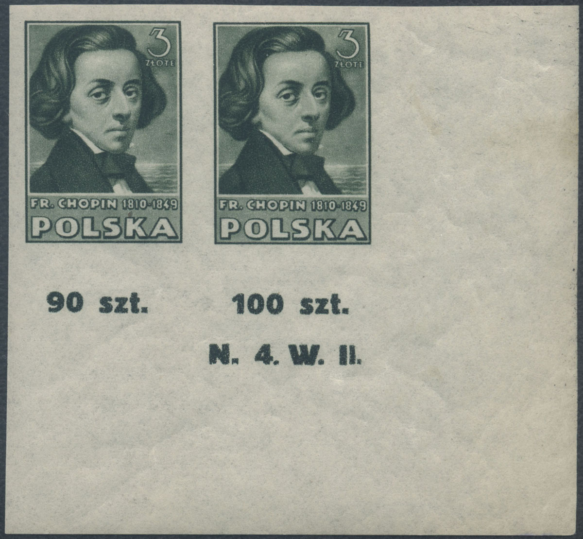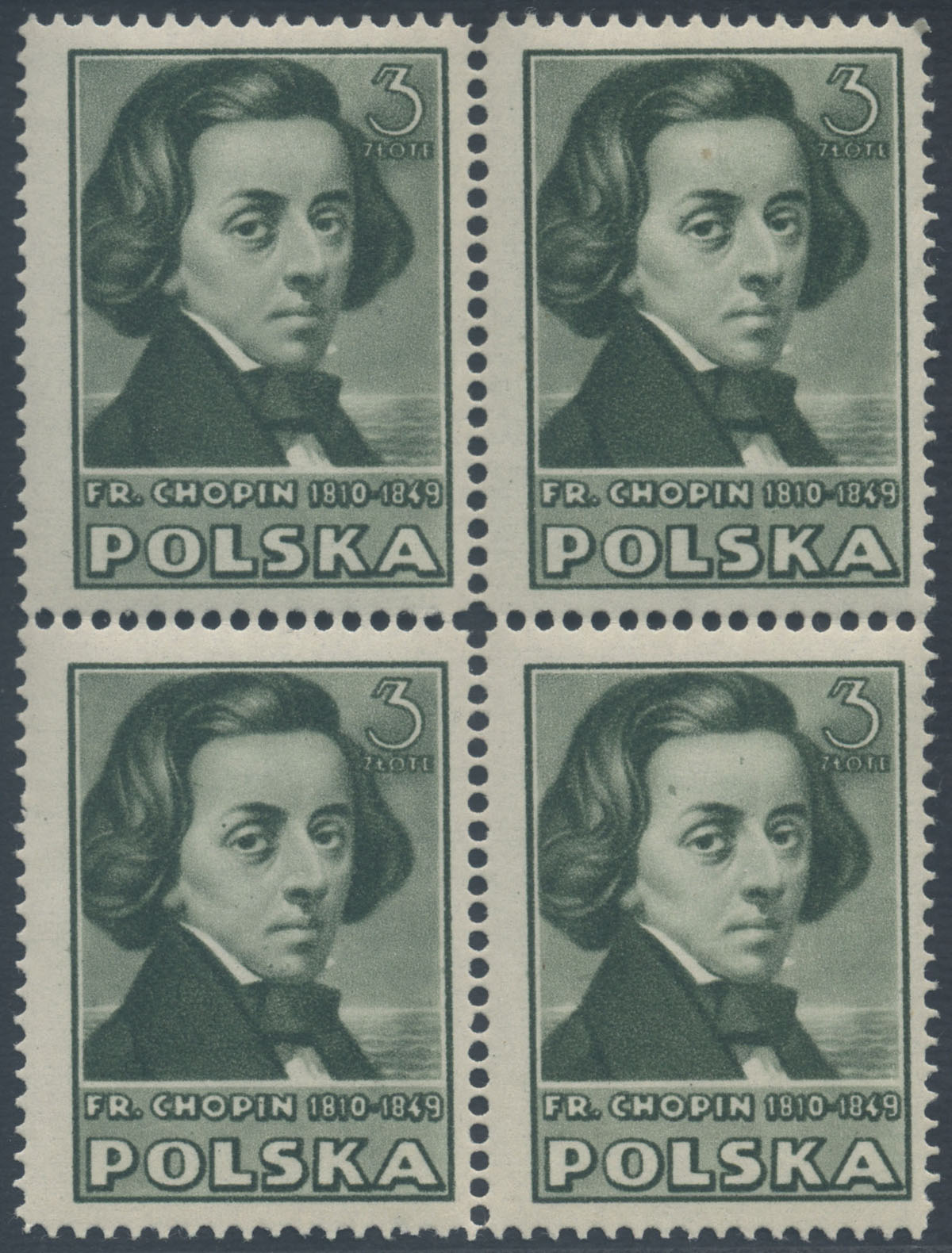 1947 Kultura Polska II wydanie - Fr.Chopin; czworoblok unikalnych prób znaczka za 3 zł. w kolorze szarozielonym, drukowanych z walca N.2.W.II - oznaczenie znajduje się pod 91 i 100 znaczkiem w arkuszu i tylko próby z tych dwóch pozycji można łatwo zidentyfikować; próba była drukowana 2.VII.1947 roku i nie została w tej formie przyjęta do druku, adnotacja "próba" prof.S.Miksteina na dolnym marginesie; w katalogu Fischera pojawiły się pierwsze próby obu wydań i to coraz dokładniej skatalogowane - z pierwszego skatalogowano trzy, z drugiego dziesięć - w tym te za 3 i 10 zł. z walca W.II (Fi.po 2000 - a z numerem walca po 5000.-), próby z Mickiewiczem opisał L.Schmutz w styczniowym numerze Filatelisty z 2018 roku na str.38-42 i w ślad za tą publikacją wszystkie zostaną pewnie po wielu latach prawidłowo skatalogowane, gwarancja i opis Schmutz. | Fi.431 P1 Mi.465 |