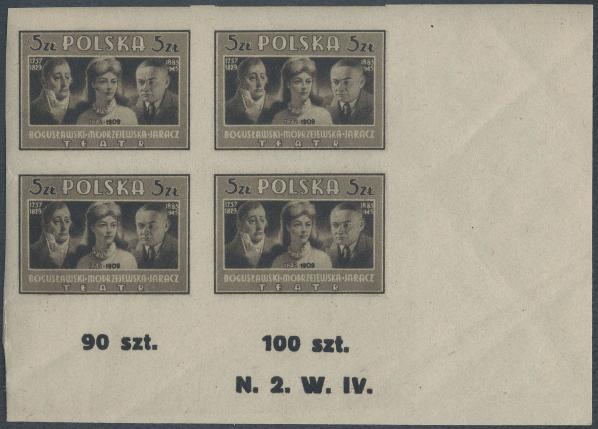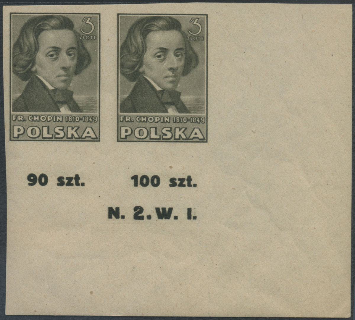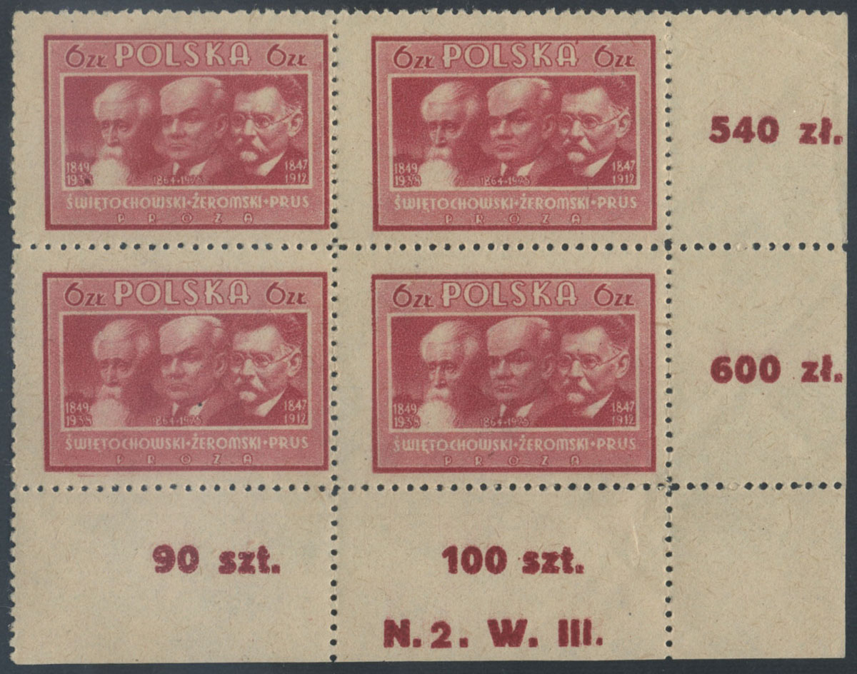 1947 Kultura Polska II wydanie - Fr.Chopin; czworoblok unikalnych prób znaczka za 3 zł. w kolorze szarozielonym, drukowanych z walca N.2.W.II - oznaczenie znajduje się pod 91 i 100 znaczkiem w arkuszu i tylko próby z tych dwóch pozycji można łatwo zidentyfikować; próba była drukowana 2.VII.1947 roku i nie została w tej formie przyjęta do druku, adnotacja "próba" prof.S.Miksteina na dolnym marginesie; w katalogu Fischera pojawiły się pierwsze próby obu wydań i to coraz dokładniej skatalogowane - z pierwszego skatalogowano trzy, z drugiego dziesięć - w tym te za 3 i 10 zł. z walca W.II (Fi.po 2000 - a z numerem walca po 5000.-), próby z Mickiewiczem opisał L.Schmutz w styczniowym numerze Filatelisty z 2018 roku na str.38-42 i w ślad za tą publikacją wszystkie zostaną pewnie po wielu latach prawidłowo skatalogowane, gwarancja i opis Schmutz. | Fi.431 P1 Mi.465 |