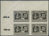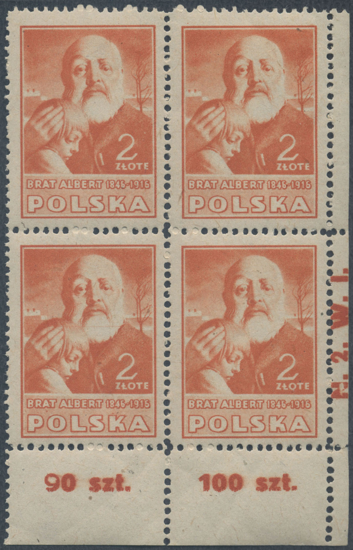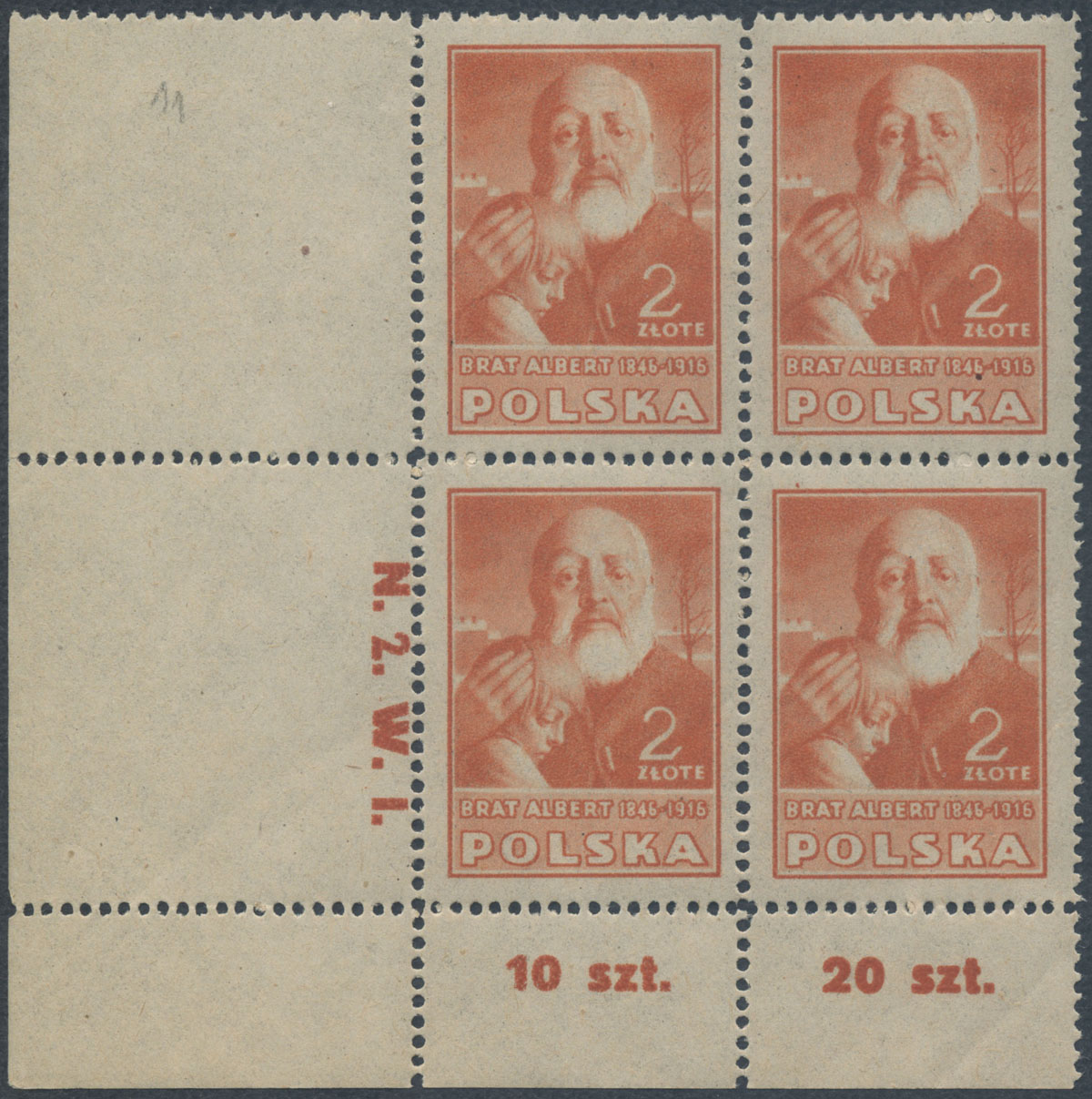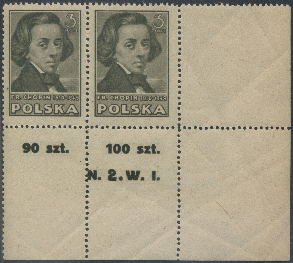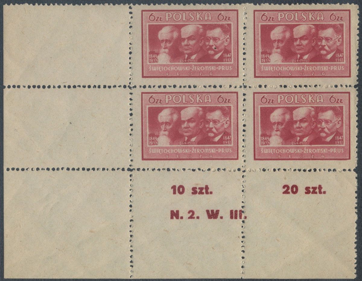 1947 Kultura Polska II wydanie - Fr.Chopin; czworoblok unikalnych prób znaczka za 3 zł. w kolorze szarozielonym, drukowanych z walca N.2.W.II - oznaczenie znajduje się pod 91 i 100 znaczkiem w arkuszu i tylko próby z tych dwóch pozycji można łatwo zidentyfikować; próba była drukowana 2.VII.1947 roku i nie została w tej formie przyjęta do druku, adnotacja "próba" prof.S.Miksteina na dolnym marginesie; w katalogu Fischera pojawiły się pierwsze próby obu wydań i to coraz dokładniej skatalogowane - z pierwszego skatalogowano trzy, z drugiego dziesięć - w tym te za 3 i 10 zł. z walca W.II (Fi.po 2000 - a z numerem walca po 5000.-), próby z Mickiewiczem opisał L.Schmutz w styczniowym numerze Filatelisty z 2018 roku na str.38-42 i w ślad za tą publikacją wszystkie zostaną pewnie po wielu latach prawidłowo skatalogowane, gwarancja i opis Schmutz. | Fi.431 P1 Mi.465 |