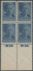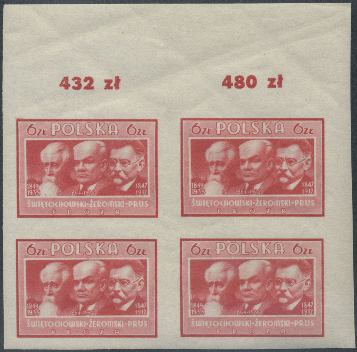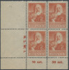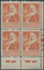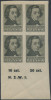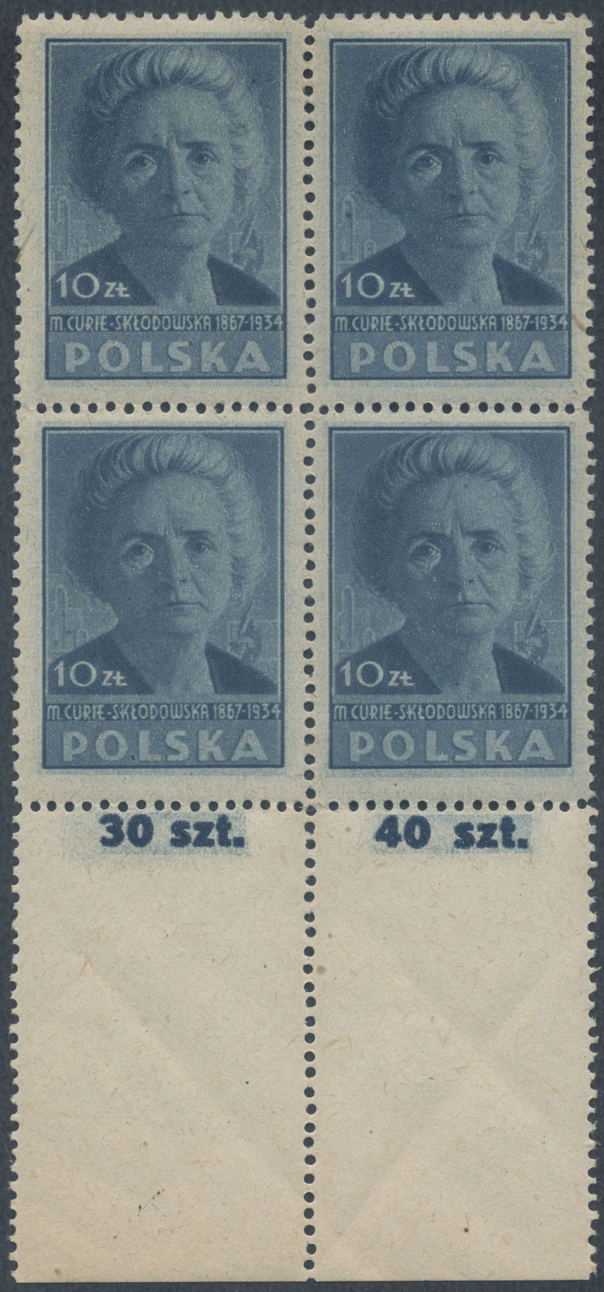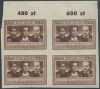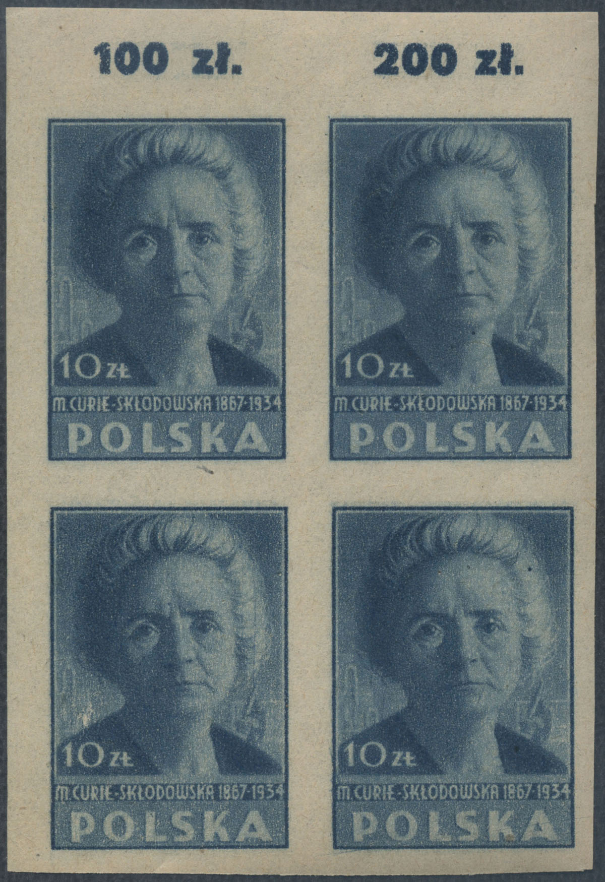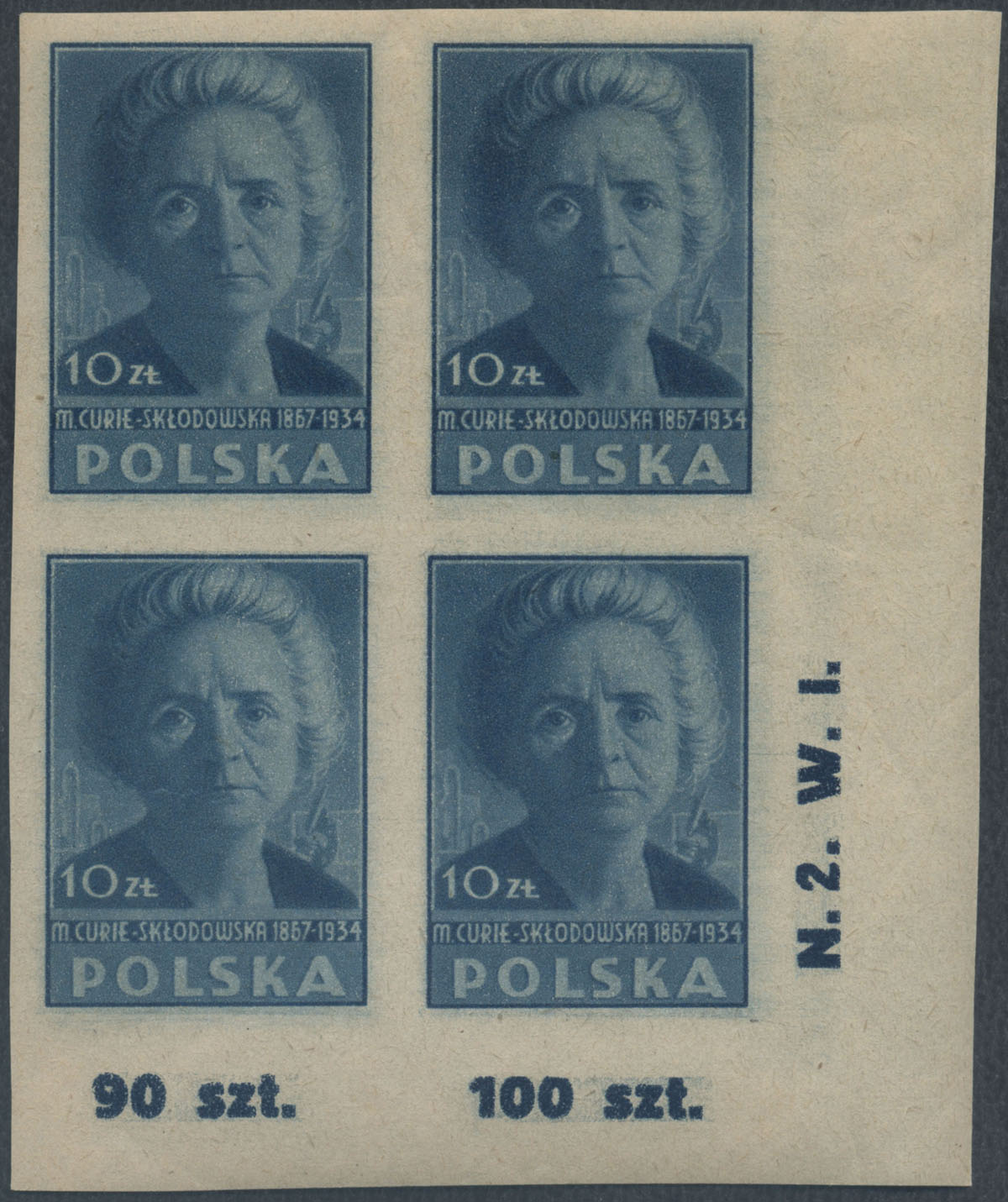 1947 Kultura Polska II wydanie - M.Curie Skłodowska; czworoblok unikalnych prób znaczka za 10 zł. w kolorze ciemnoniebieskim, drukowanych z walca N.2.W.II - oznaczenie znajduje się za 10 i 100 znaczkiem w arkuszu i tylko próby z tych dwóch pozycji można łatwo zidentyfikować; próba była drukowana 2.VI.1947 roku i nie została w tej formie przyjęta do druku, stosowna adnotacja prof.S.Miksteina na dolnym marginesie; w katalogu Fischera pojawiły się pierwsze próby obu wydań i to coraz dokładniej skatalogowane - z pierwszego skatalogowano trzy, z drugiego dziesięć - w tym te za 3 i 10 zł. z walca W.II (Fi.po 2000 - a z numerem walca po 5000.-), próby z Mickiewiczem opisał L.Schmutz w styczniowym numerze Filatelisty z 2018 roku na str.38-42 i w ślad za tą publikacją wszystkie zostaną pewnie po wielu latach prawidłowo skatalogowane, gwarancja i opis Schmutz. | Fi.434 P1 Mi.468 |