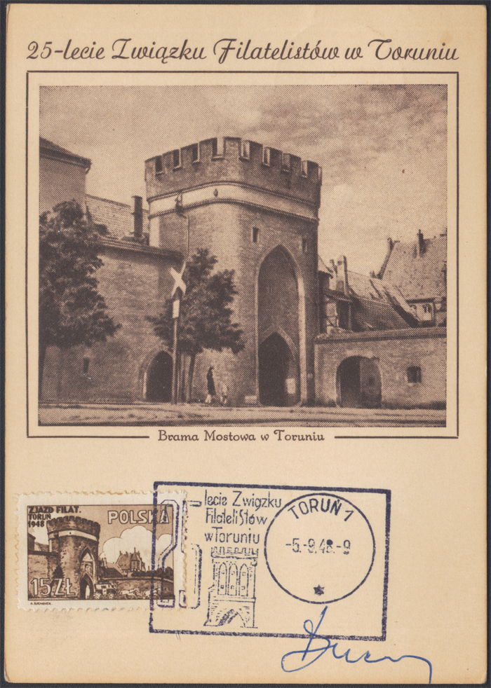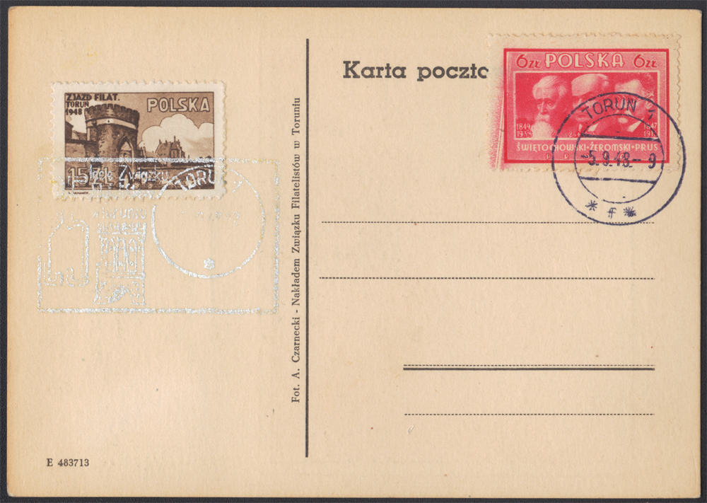 1947 Kultura polska (II) - Pisarze, ząbkowany znaczek za 6 zł z błędem "smuga farby z lewej strony" skasowany datownikiem na odwrocie karty maksimum "25-lecie Związku Filatelistów w Toruniu", poniżej znaczek skasowany stemplem okolicznościowym w kolorze srebrnym (Myślicki 48 110); bardzo dobry stan zachowania. | Fi.433B, 468 Mi.467B, 503 |