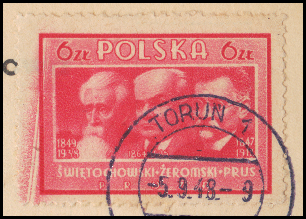1947 kultura polska, znaczek makulaturowy ze pionową smugą farby, prawie dokładnie przez środek twarzy brata Alberta, gwarancja Wiatrowski. | Fi.430A MK Mi.464B |