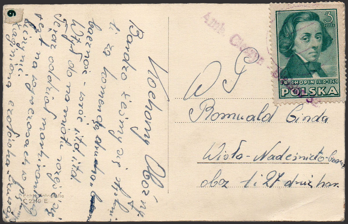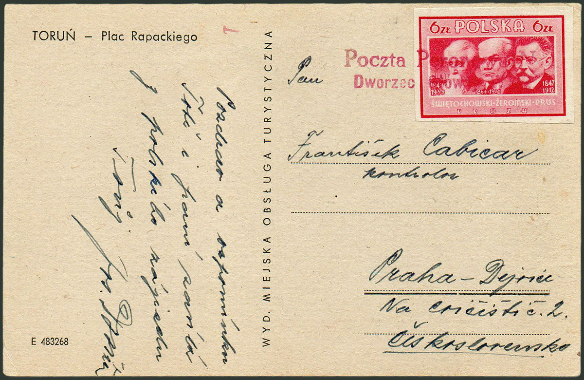 1947 poczta peronowa Dworzec Główny, kartka do Czechosłowacji nadane na poczcie peronowej, znaczek ze stemplem „Poczta Peronowa / Dworzec Główny”. | Fi.433A |
